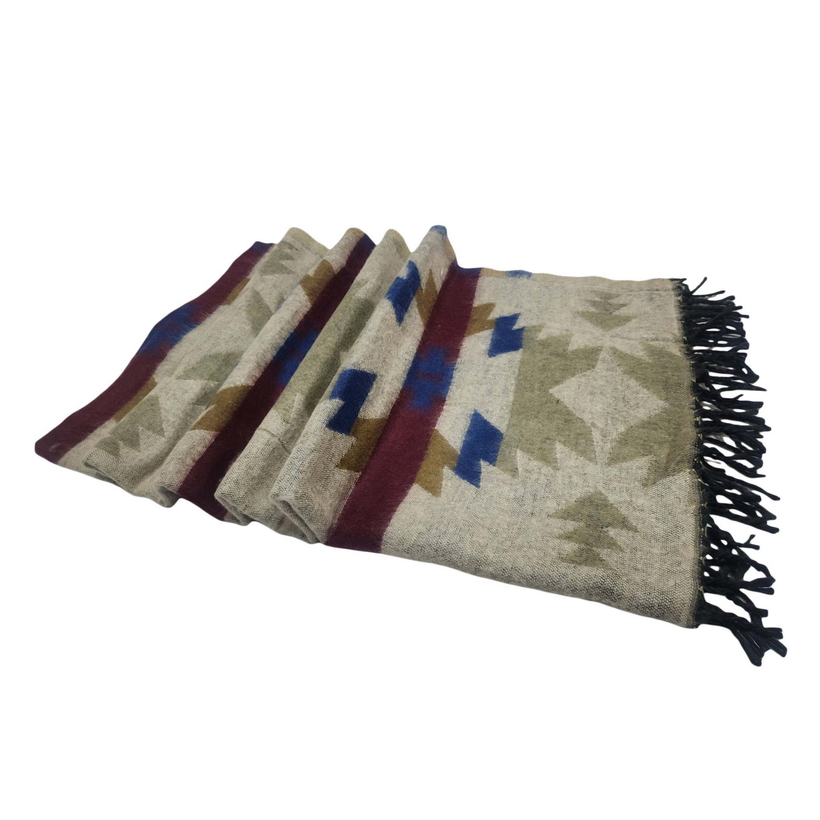 This is an acrylic woolen shawl, also known as the Indian multi-color shawl or Dhaka shawl. These shawls are made from high-quality acrylic wool and feature various eye-catching patterns created on looms. They are not only attractive but also very durable.