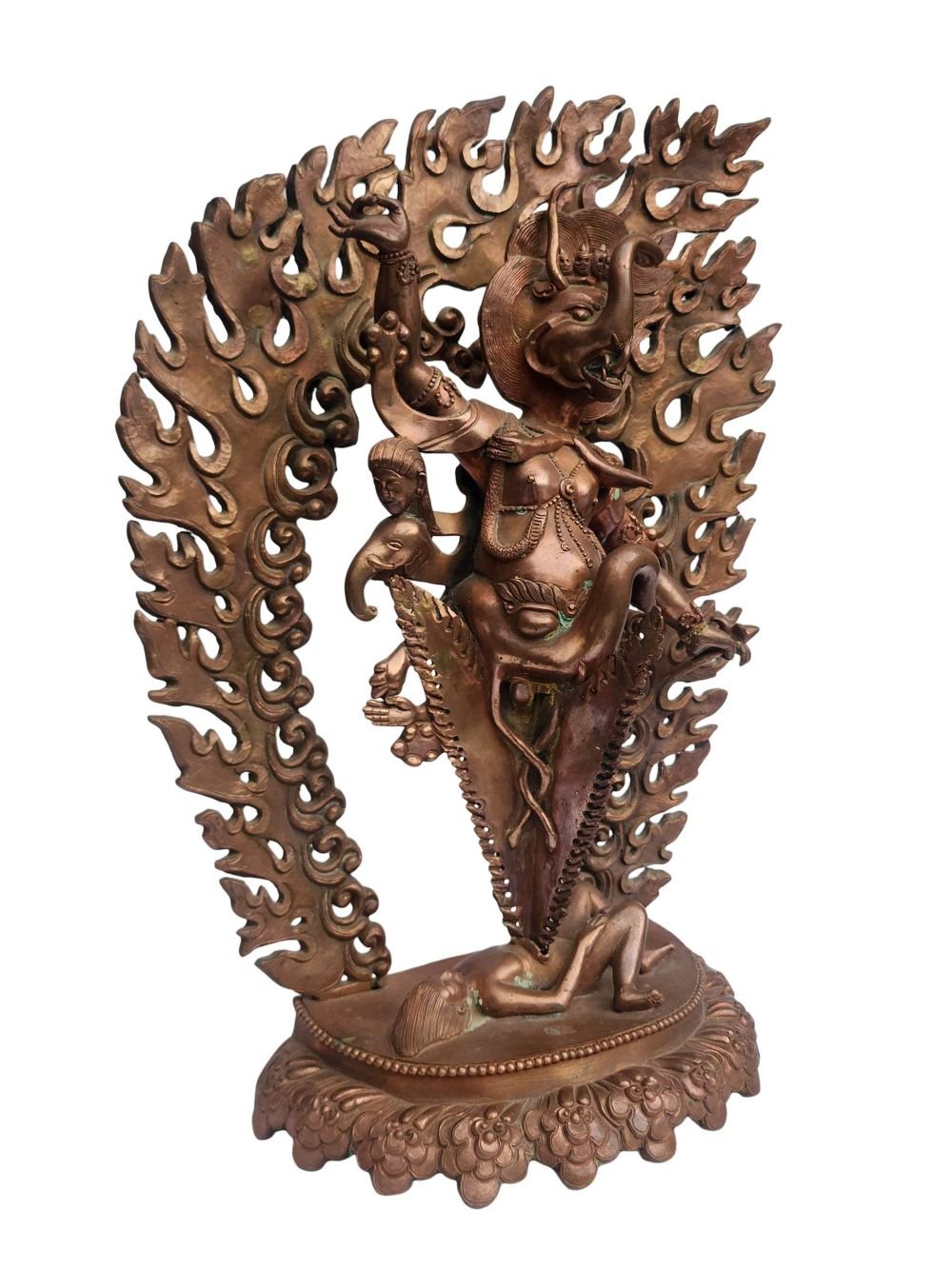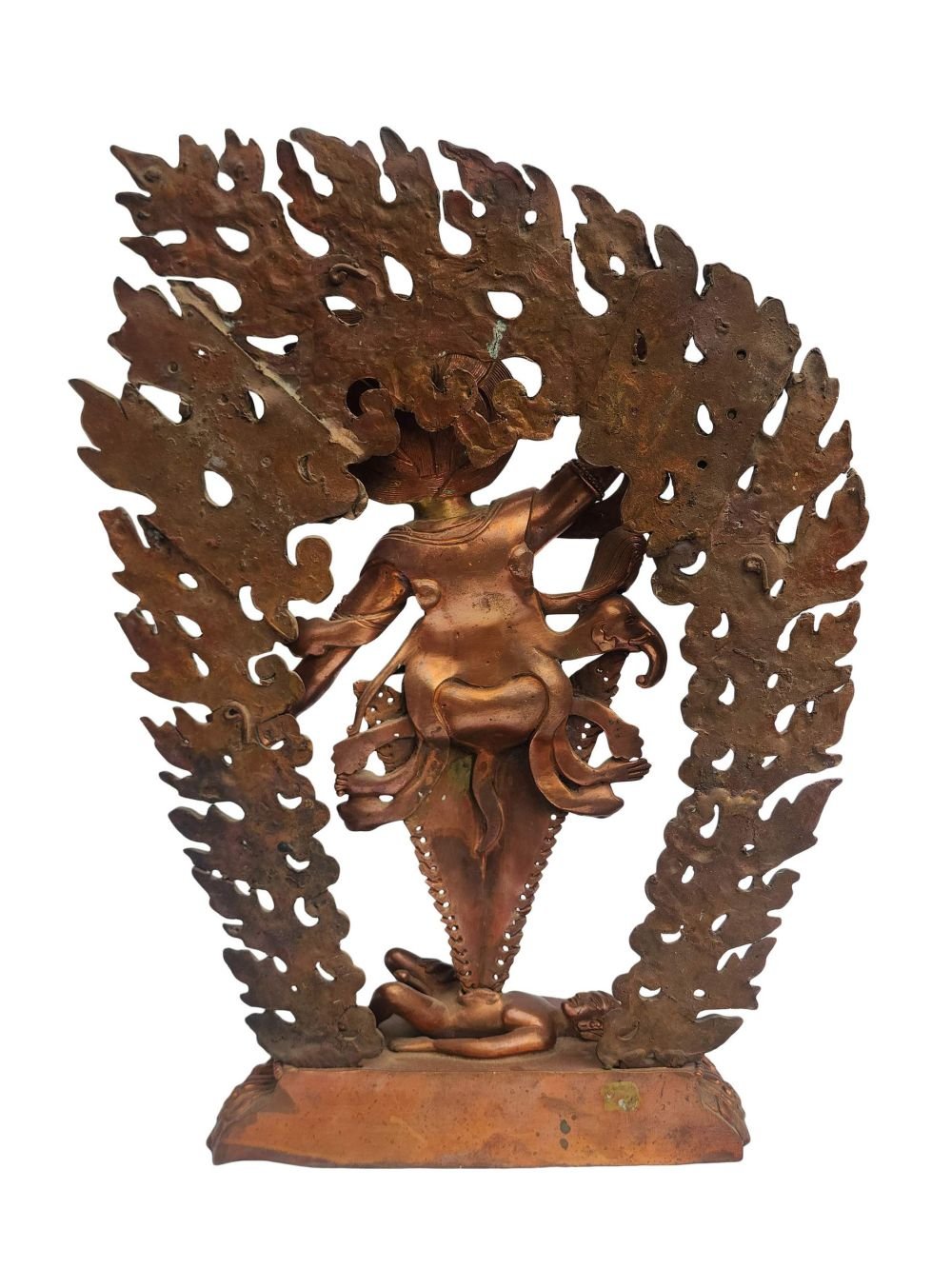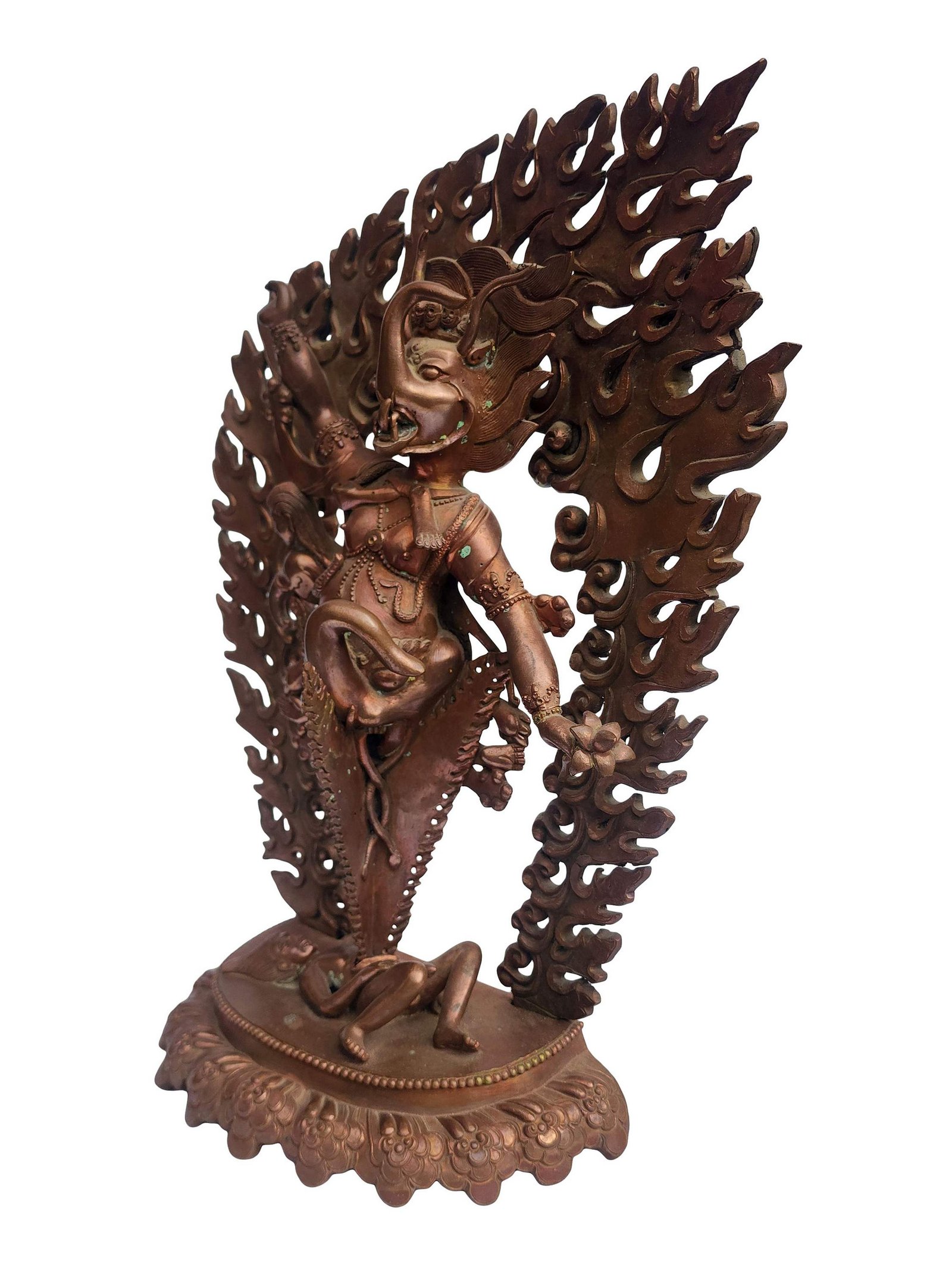 This Phurba has been meticulously treated with a chocolate color antique patina. The intention behind this patina is to replicate the appearance of a copper statue that has gracefully aged over a century. Unlike a simple coat of paint, this patina is not applied superficially and is designed to endure. It undergoes an artificial oxidation process that adds depth and character, while also serving as a protective layer against natural oxidation.