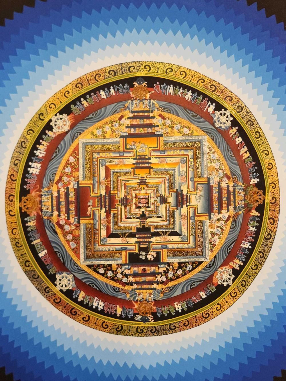 The Kalachakra deity resides in the centre of the mandala. His palace consists of our mandala, one within another: the mandala of body, the mandala of speech, that of mind, and the very centre, wisdom and great bliss.