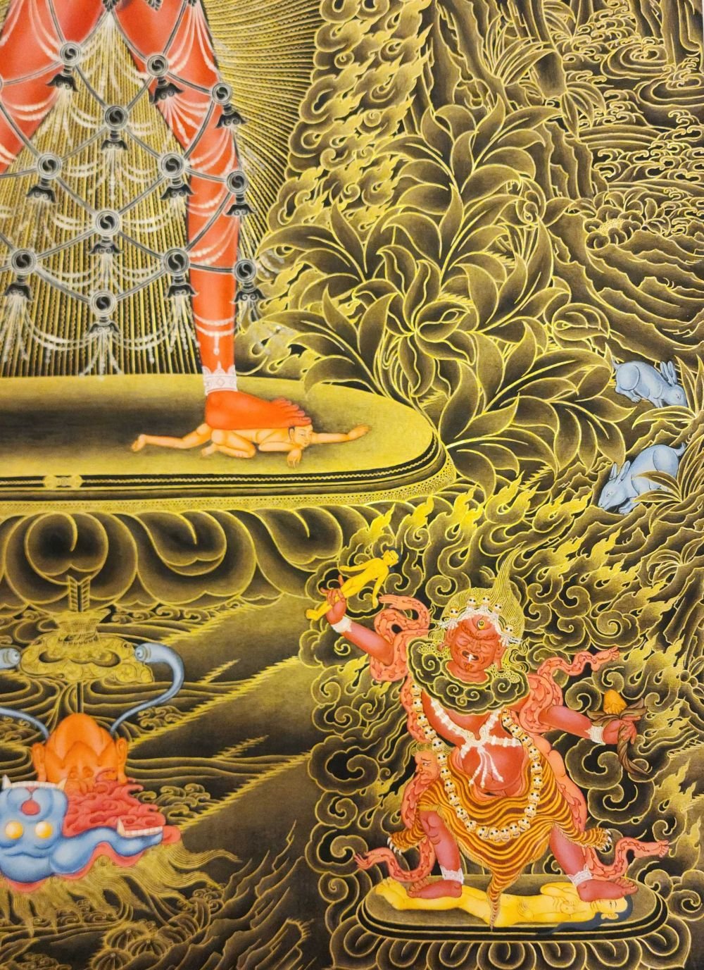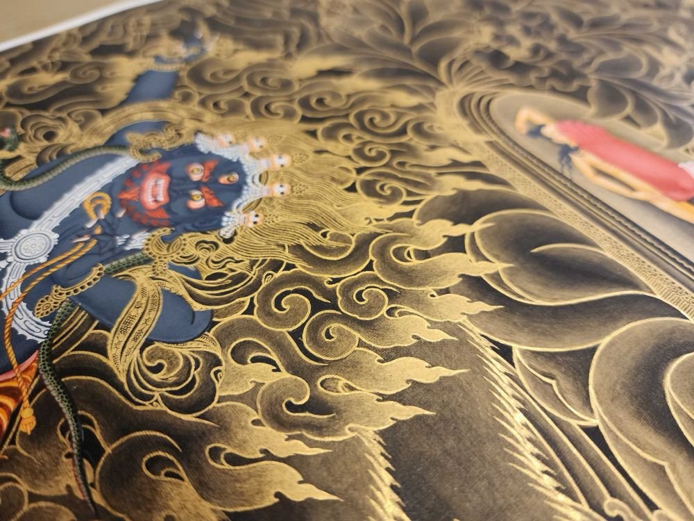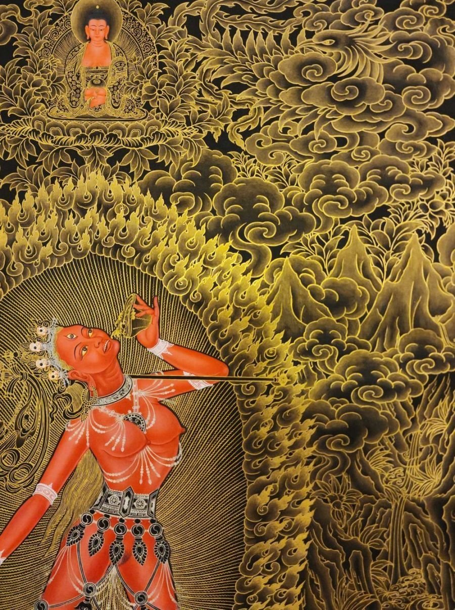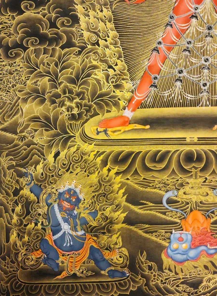 This thangka of Vajrayogini has real gold painted on its surface along with other paints. This is an ancient process of decorating the thangka in Tibetan Buddhism, Here gold is ground into gold dust, which is then mixed with other undisclosed material to make it paintable on the canvas. this mixture is then mixed with transparent glue and painted on the thangka. Read More