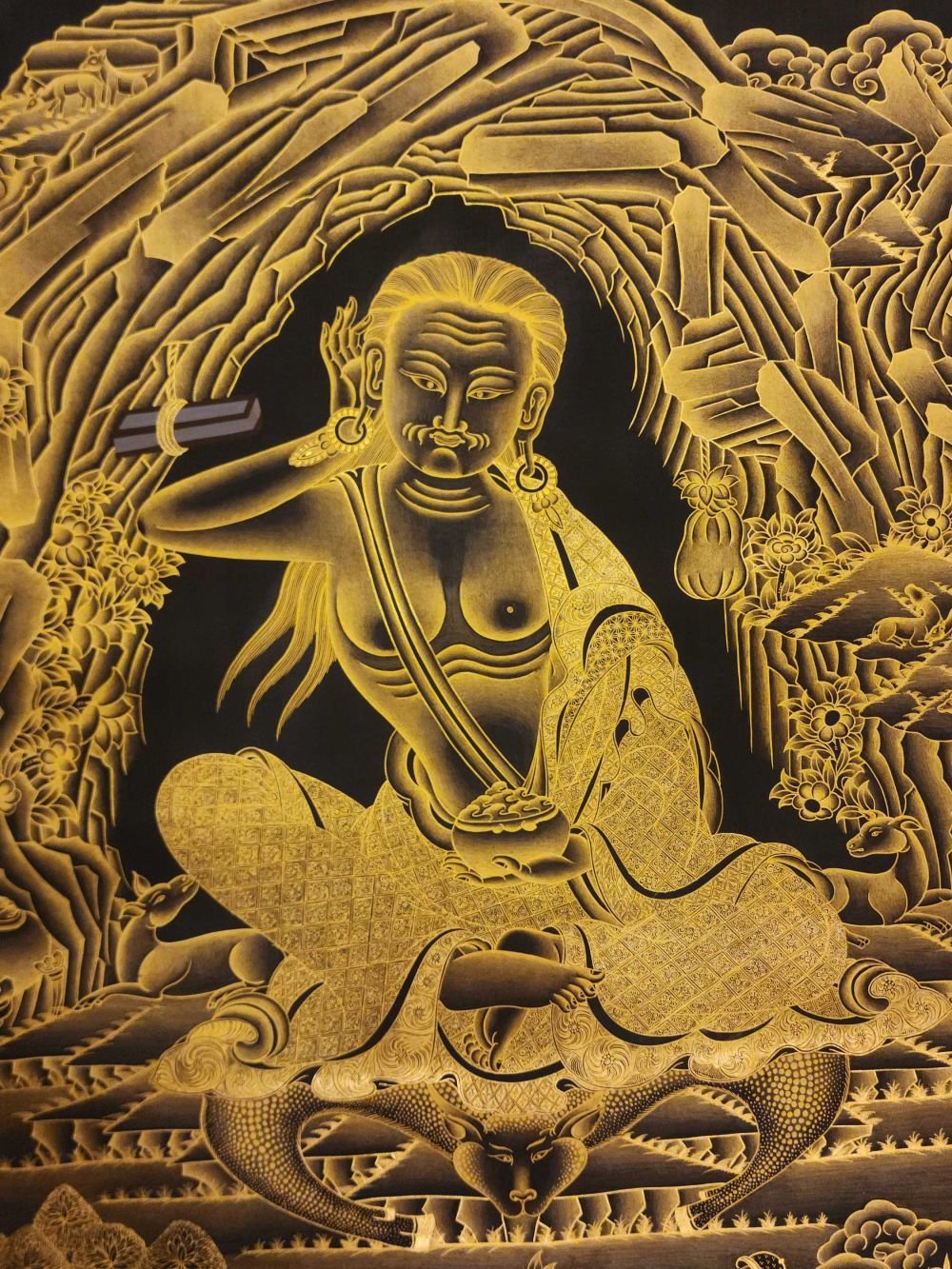 This thangka of Milarepa has real gold painted on its surface along with other paints. This is an ancient process of decorating the thangka in Tibetan Buddhism, Here gold is ground into gold dust, which is then mixed with other undisclosed material to make it paintable on the canvas. this mixture is then mixed with transparent glue and painted on the thangka. Read More