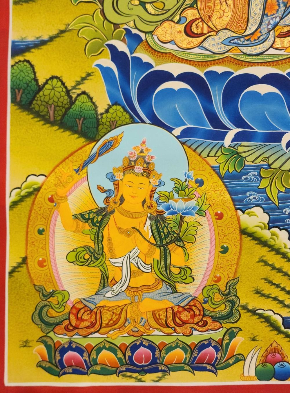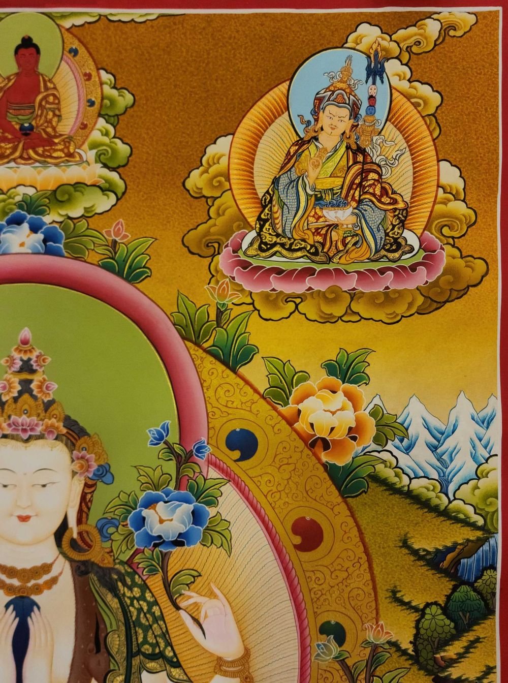 Chenrezig Thangka, Buddhist Traditional Painting, Tibetan Style, Real Gold, Three Great Bodhisattvas , Bodhisattva of Compassion, Protector of All Beings
