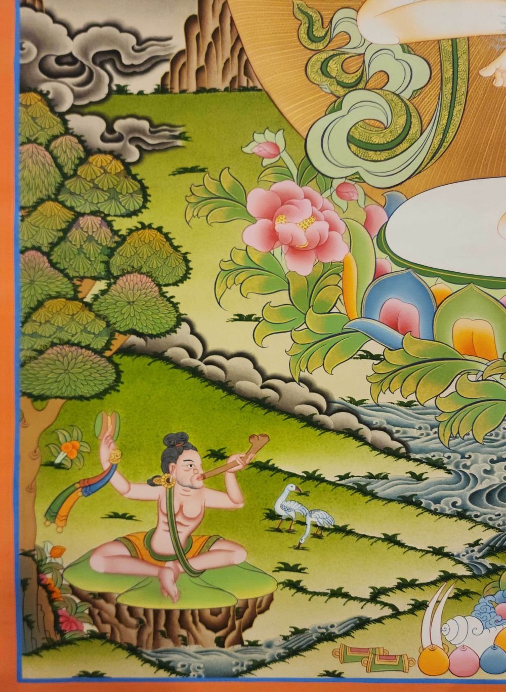 This thangka of Machig Labdron has real gold painted on its surface along with other paints. This is an ancient process of decorating the thangka in Tibetan Buddhism, Here gold is ground into gold dust, which is then mixed with other undisclosed material to make it paintable on the canvas. this mixture is then mixed with transparent glue and painted on the thangka. Read More
