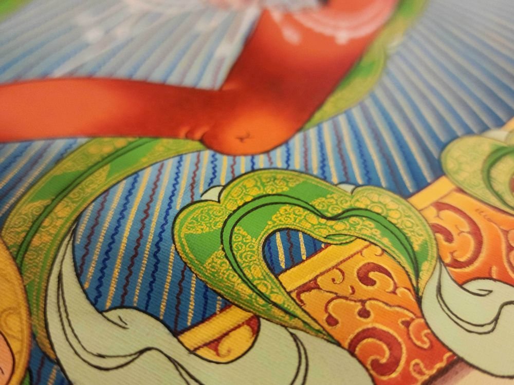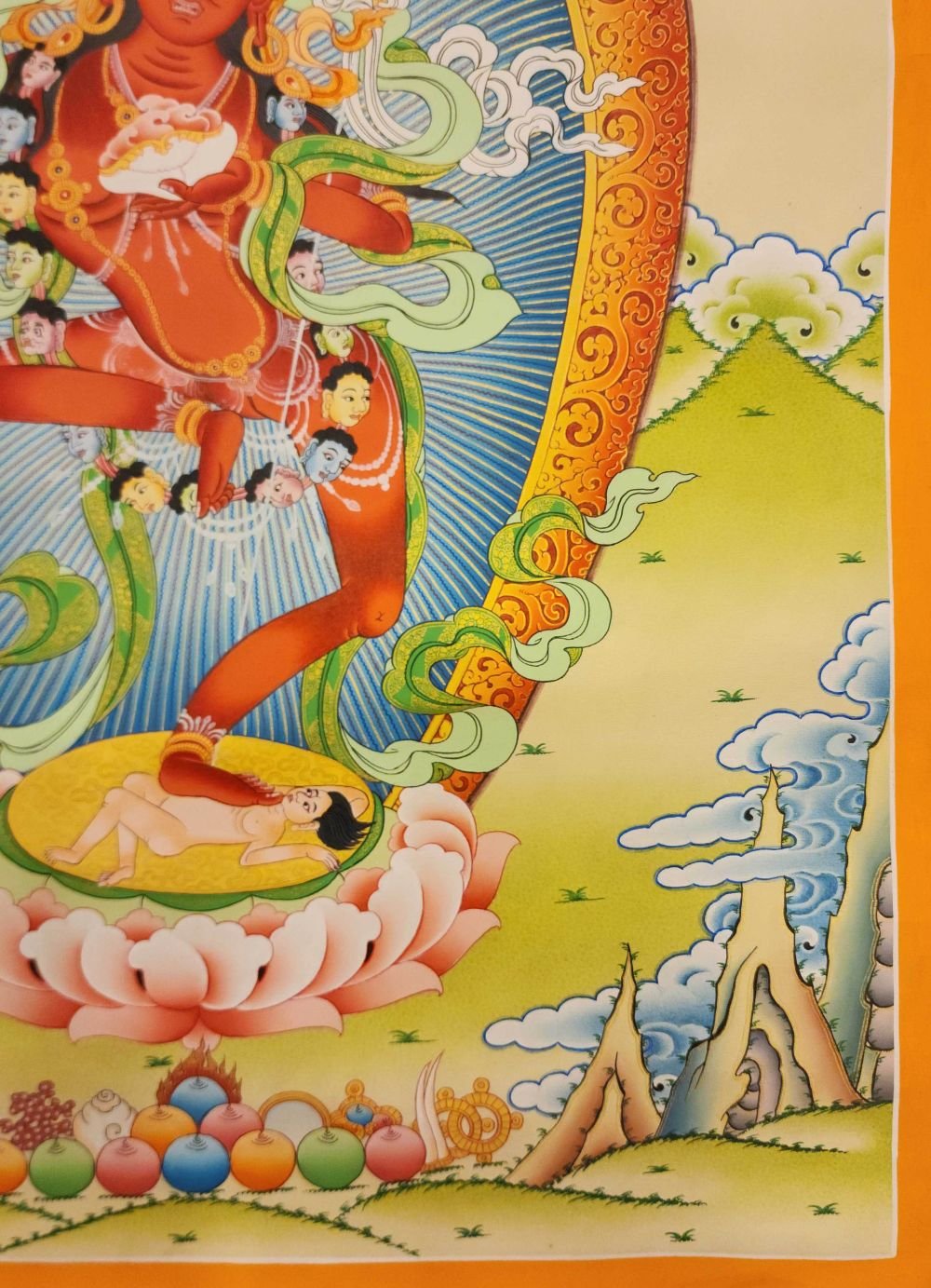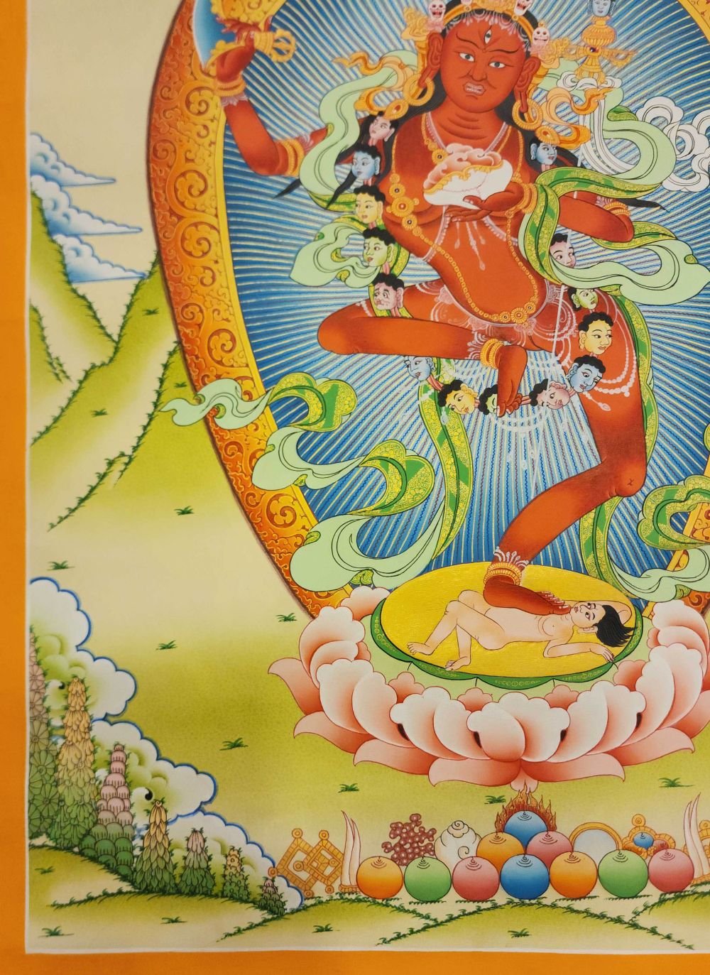 This thangka of Vajravarahi has real gold painted on its surface along with other paints. This is an ancient process of decorating the thangka in Tibetan Buddhism, Here gold is ground into gold dust, which is then mixed with other undisclosed material to make it paintable on the canvas. this mixture is then mixed with transparent glue and painted on the thangka. Read More