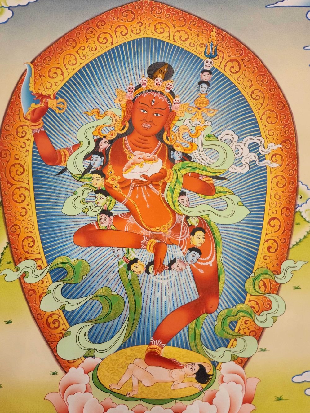 Vajravarahi has a rich history within Tibetan Buddhism. Her origins can be traced back to ancient Indian goddesses like Chinnamasta and Vajrayogini. Vajravarahi's practice was integrated into the Tibetan Buddhist tradition through the teachings of Indian masters like Naropa and Marpa, and later transmitted by Tibetan masters such as Milarepa and Tsongkhapa. Her practice became particularly prevalent in the Kagyu, Sakya, and Nyingma traditions of Tibetan Buddhism, where she is considered a key deity within the inner tantric practices.