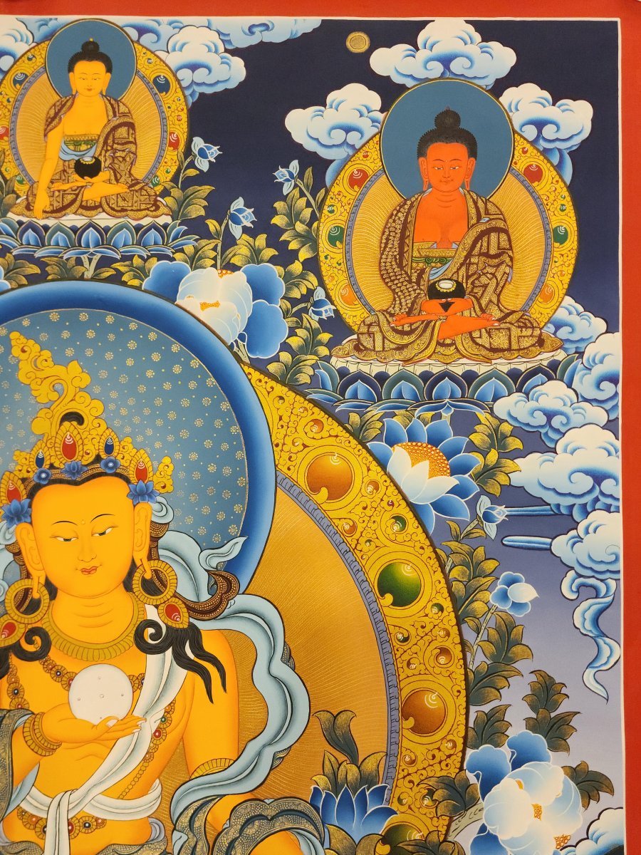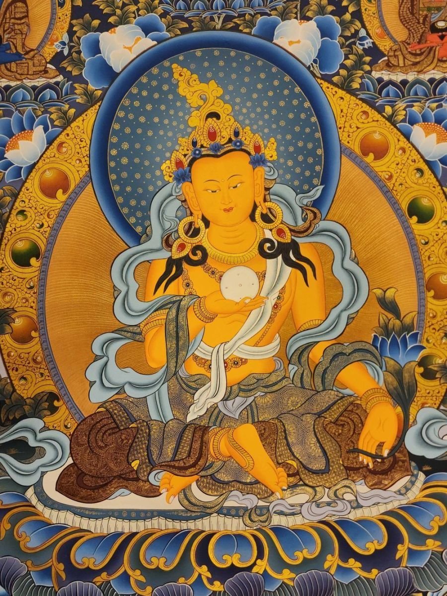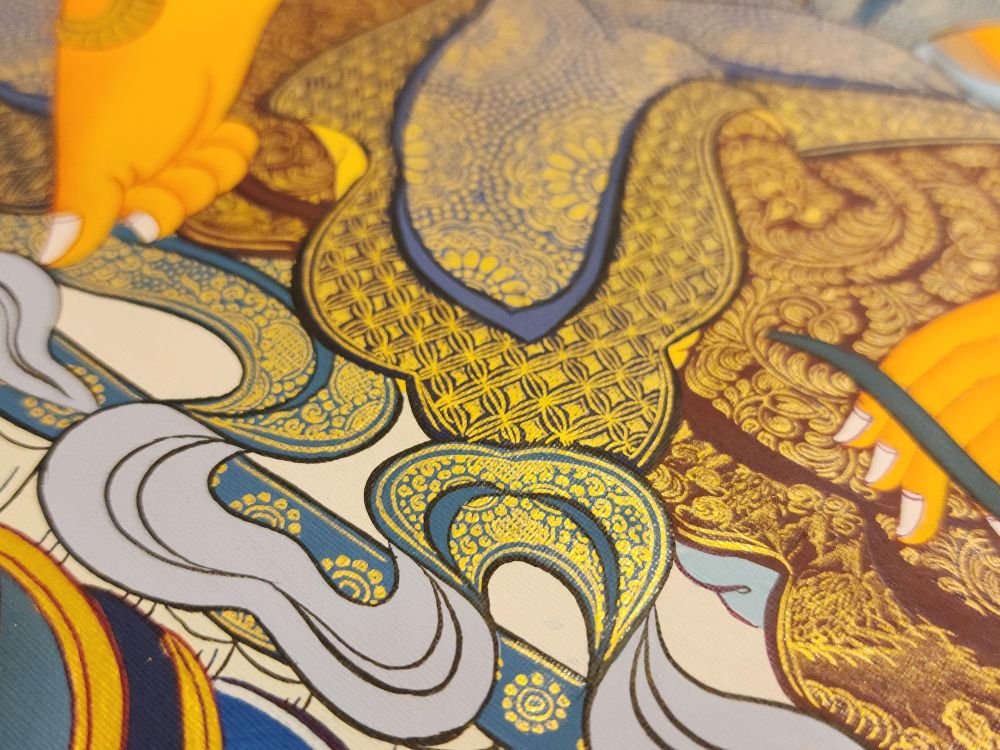This thangka of ksitigarbha has real gold painted on its surface along with other paints. This is an ancient process of decorating the thangka in Tibetan Buddhism, Here gold is ground into gold dust, which is then mixed with other undisclosed material to make it paintable on the canvas. this mixture is then mixed with transparent glue and painted on the thangka. Read More