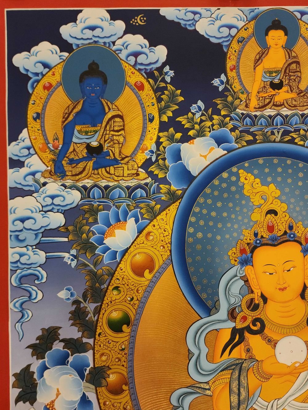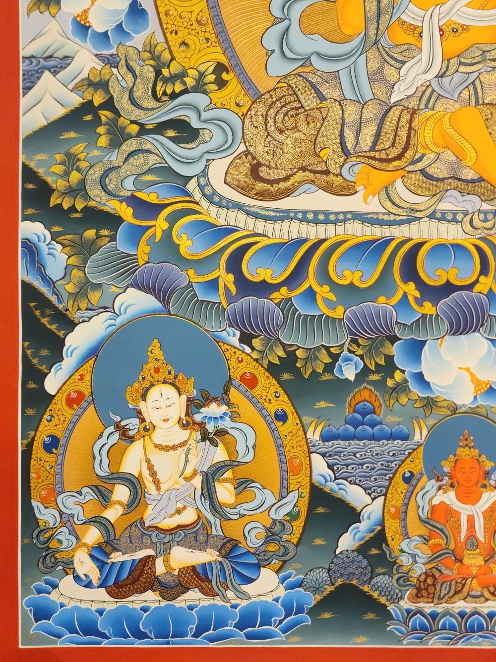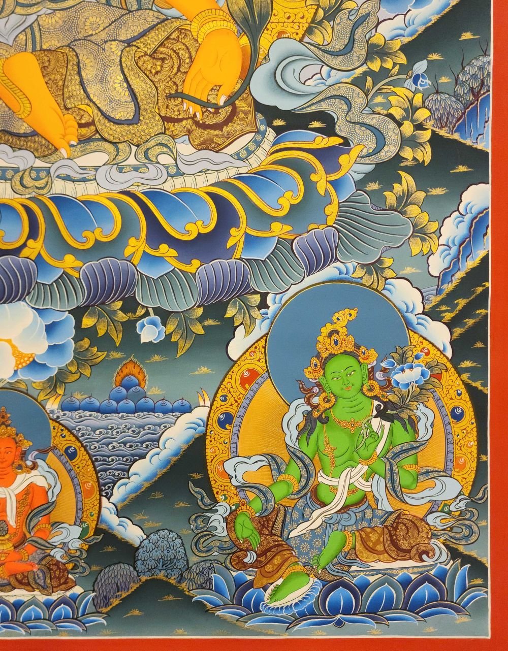 This thangka of ksitigarbha has real gold painted on its surface along with other paints. This is an ancient process of decorating the thangka in Tibetan Buddhism, Here gold is ground into gold dust, which is then mixed with other undisclosed material to make it paintable on the canvas. this mixture is then mixed with transparent glue and painted on the thangka. Read More