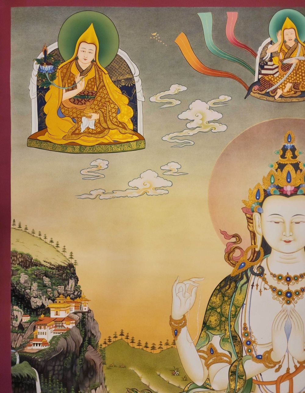Of all the deities in Mahayana Buddhism, the bodhisattva Avalokiteshvara, Chenrezig, is one of the most celebrated. He is the lord gifted with complete enlightenment, who refrains from entering the blissful state of nirvana to remain here below and save the living being of the earth. This devotion to the salvation of others emphasizes profound compassion.
