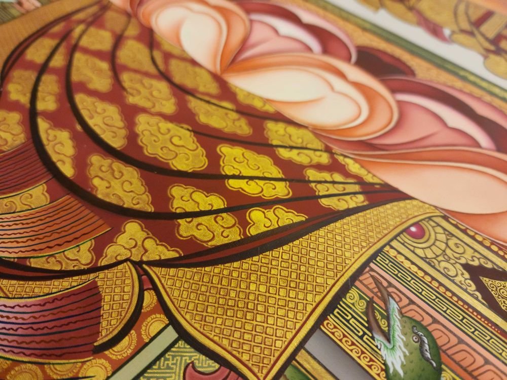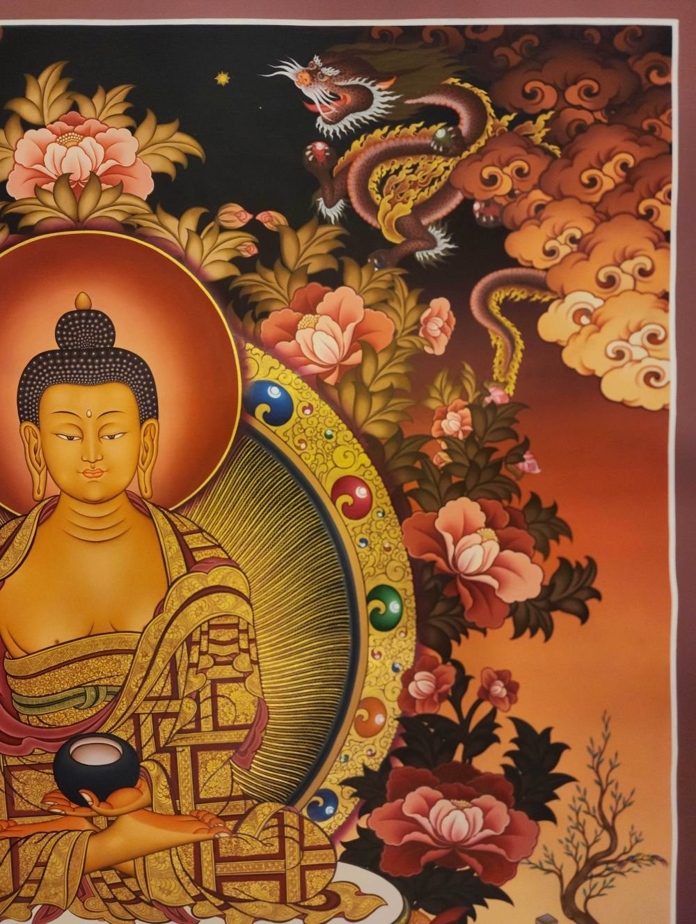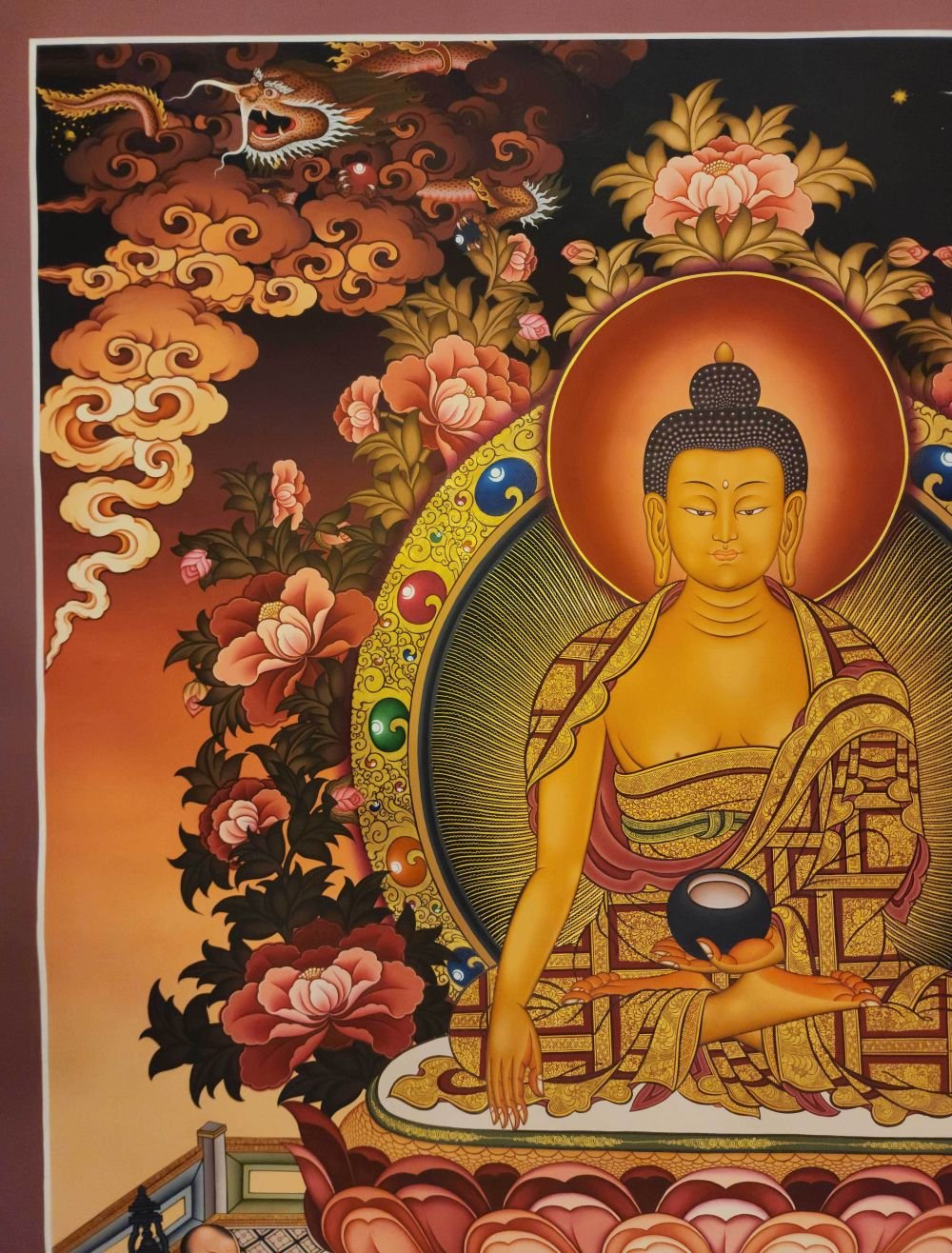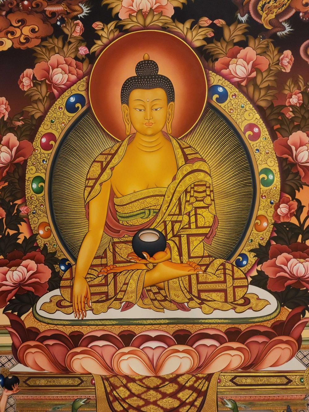 This thangka of Shakyamuni Buddha has real gold painted on its surface along with other paints. This is an ancient process of decorating the thangka in Tibetan Buddhism, Here gold is ground into gold dust, which is then mixed with other undisclosed material to make it paintable on the canvas. this mixture is then mixed with transparent glue and painted on the thangka. Read More