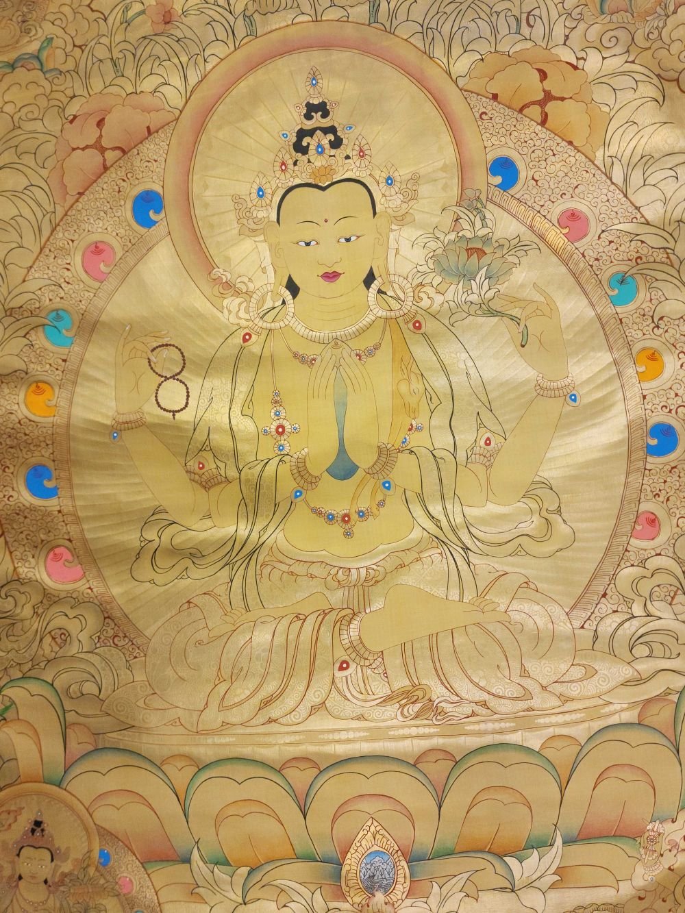Of all the deities in Mahayana Buddhism, the bodhisattva Avalokiteshvara, Chenrezig, is one of the most celebrated. He is the lord gifted with complete enlightenment, who refrains from entering the blissful state of nirvana to remain here below and save the living being of the earth. This devotion to the salvation of others emphasizes profound compassion.