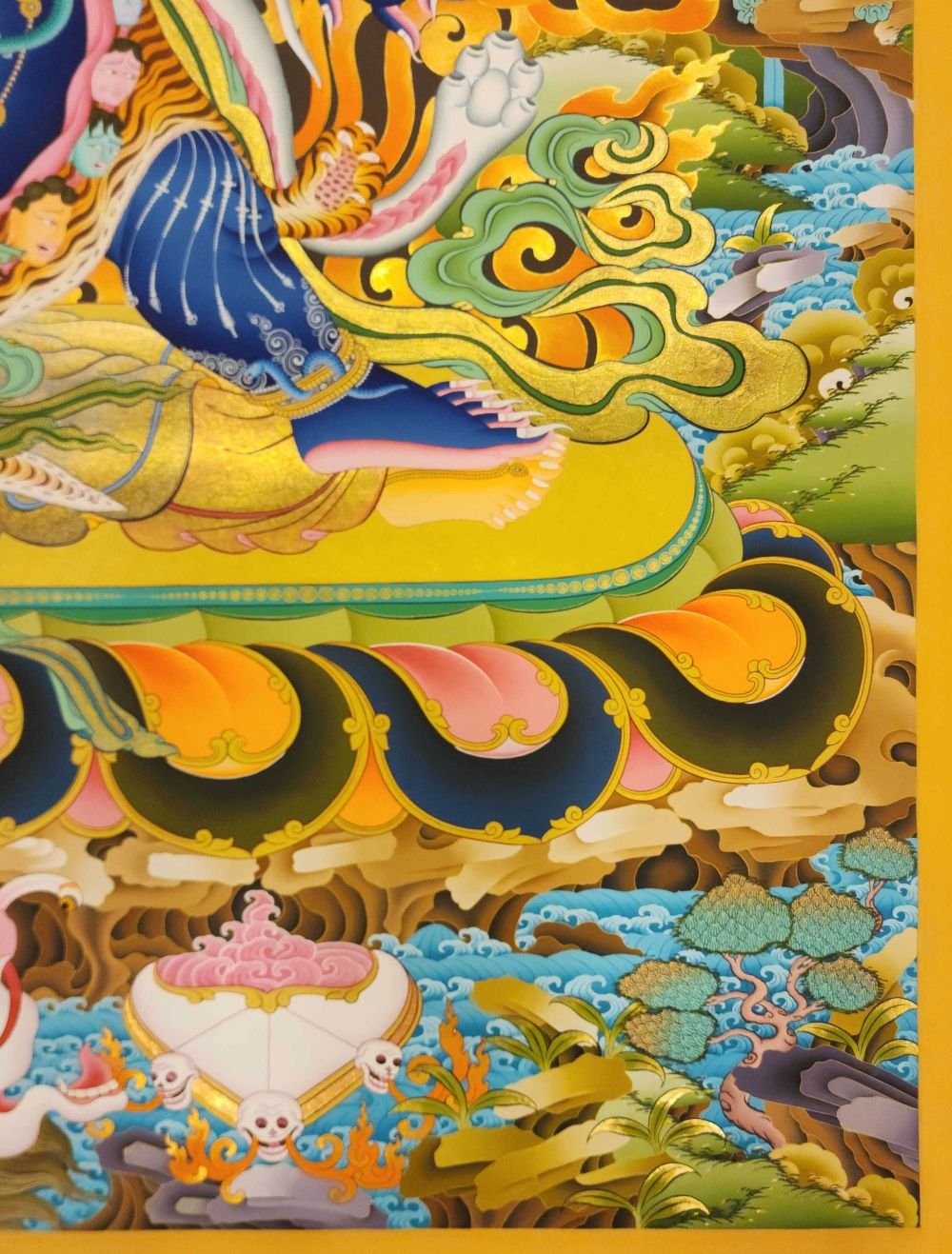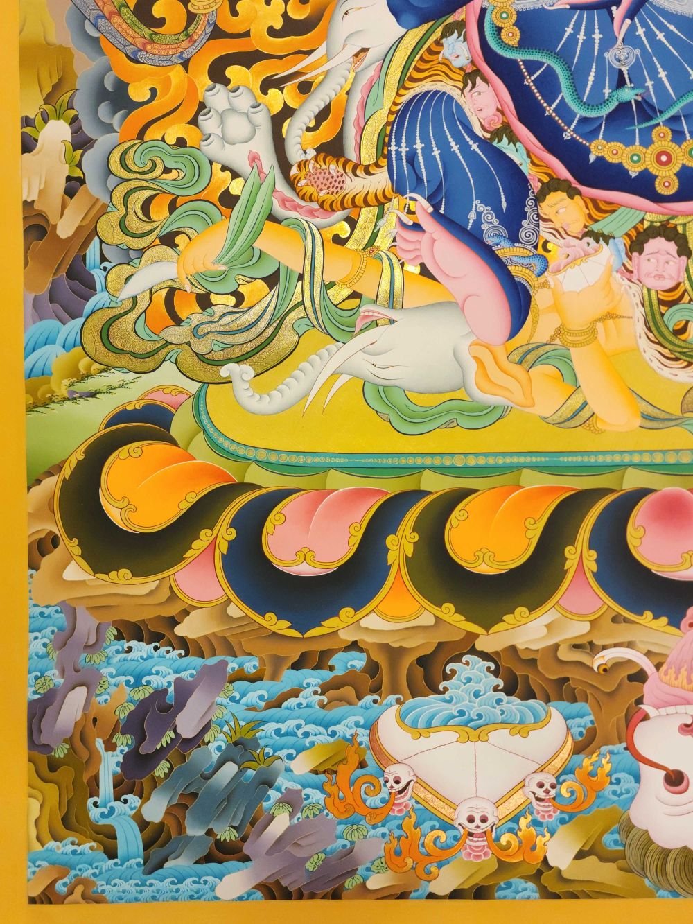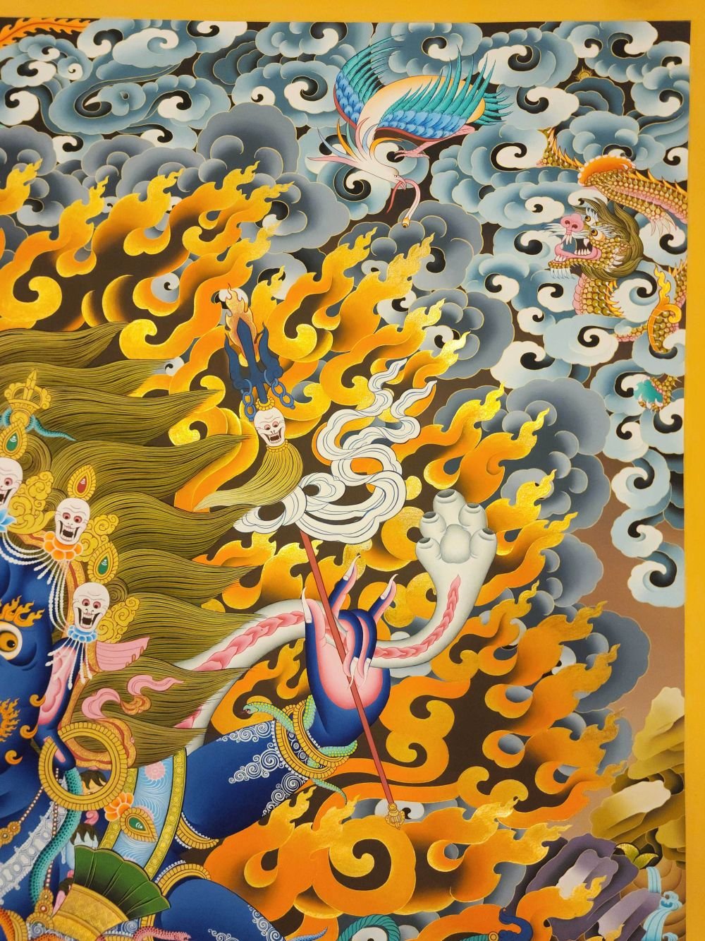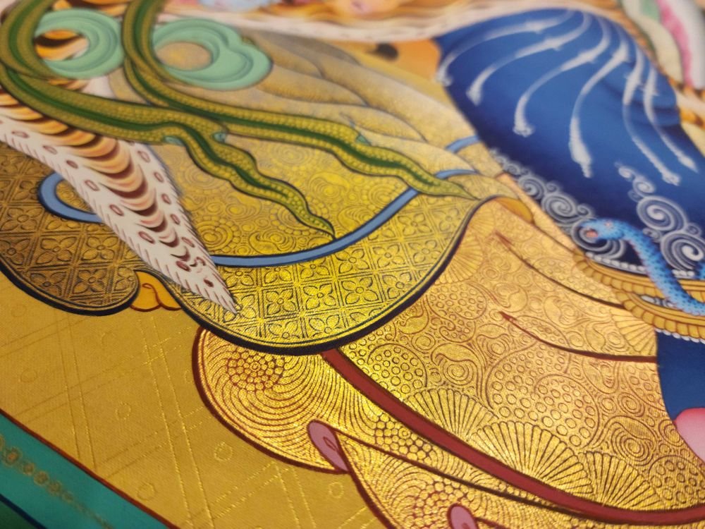 This thangka of Mahakala Black has real gold painted on its surface along with other paints. This is an ancient process of decorating the thangka in Tibetan Buddhism, Here gold is ground into gold dust, which is then mixed with other undisclosed material to make it paintable on the canvas. this mixture is then mixed with transparent glue and painted on the thangka. Read More