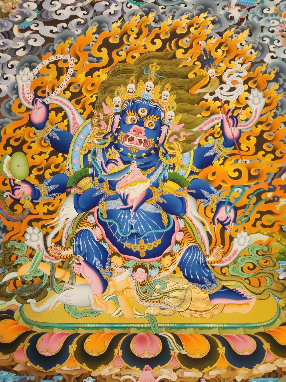 Black Mahakala is typically depicted with a fierce expression, dark blue or black, symbolizing his wrathful nature. He stands on a corpse, representing his triumph over death and impermanence. He has four arms, each holding a symbolic object. His main right hand wields a trident, representing his power over the three poisons of ignorance, attachment, and aversion. In his main left hand, he holds a skull cup filled with blood, symbolizing the transmutation of negative emotions. His remaining two hands hold a curved knife, representing the severance of ignorance, and a lasso, symbolizing the binding of negative forces.