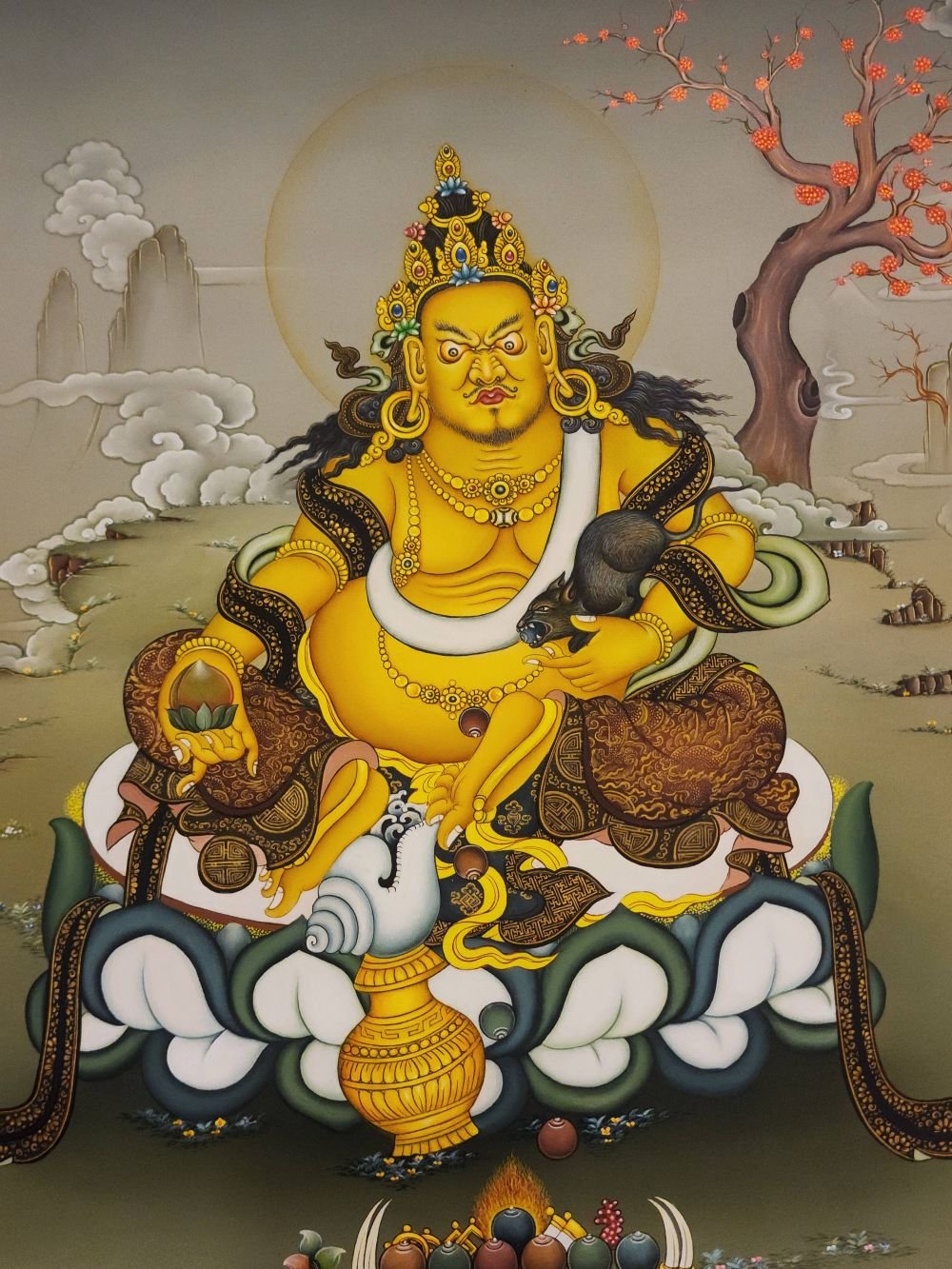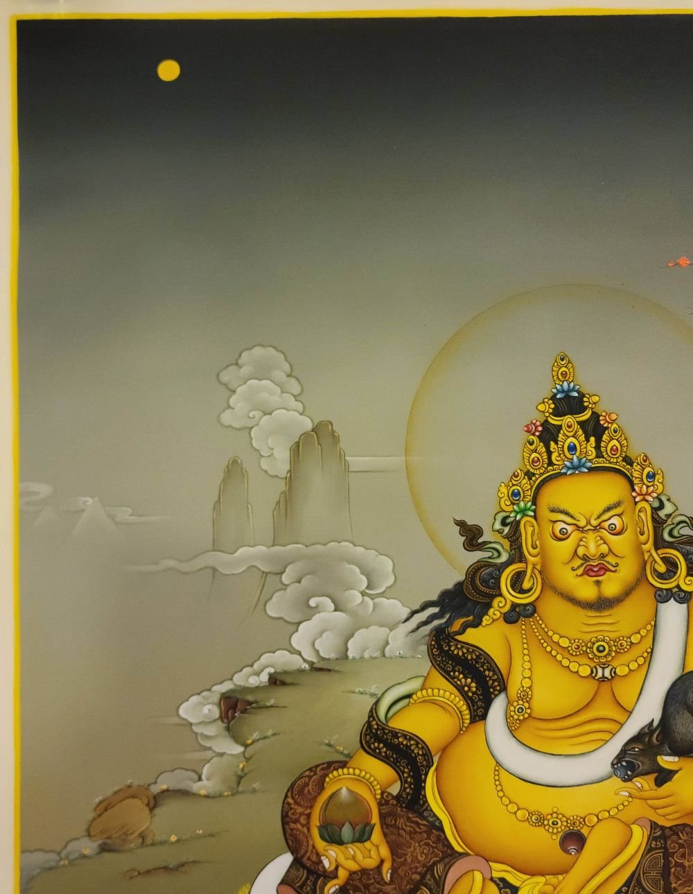 The Yellow Jambhala is considered the most popular and powerful of the Wealth Gods. He is the emanation of Buddha Ratnasambhava. He can remove poverty within the six realms, increasing virtues, life span, and wisdom.