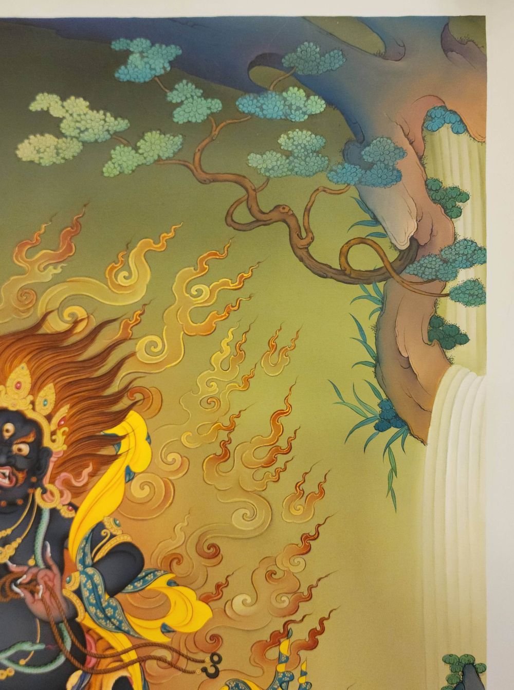 Vajrapani is pictured dancing wildly within a halo of flames, which represent transformation.