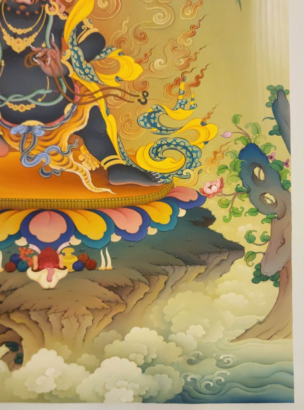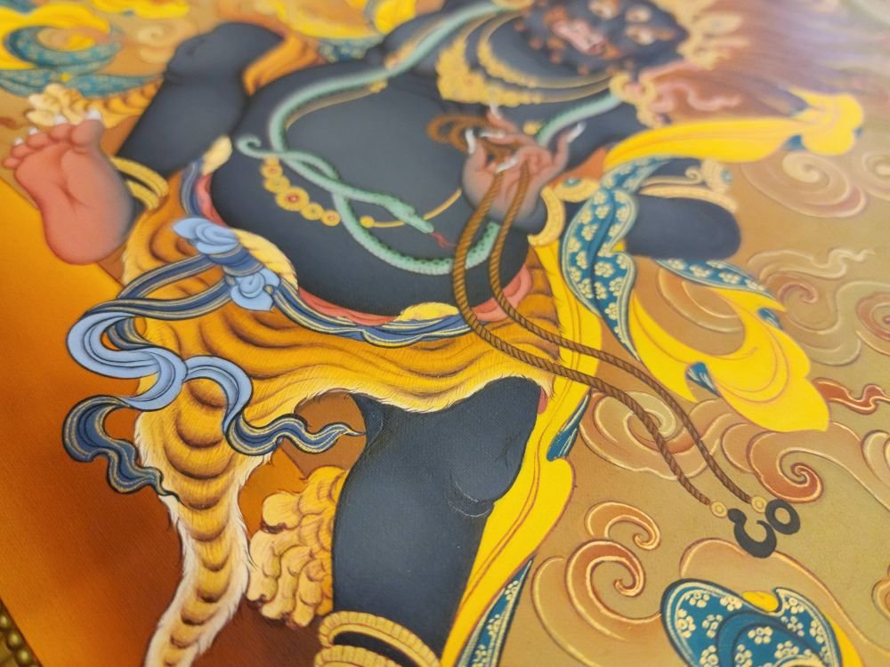 This thangka of Vajrapani has real gold painted on its surface along with other paints. This is an ancient process of decorating the thangka in Tibetan Buddhism, Here gold is ground into gold dust, which is then mixed with other undisclosed material to make it paintable on the canvas. this mixture is then mixed with transparent glue and painted on the thangka. Read More