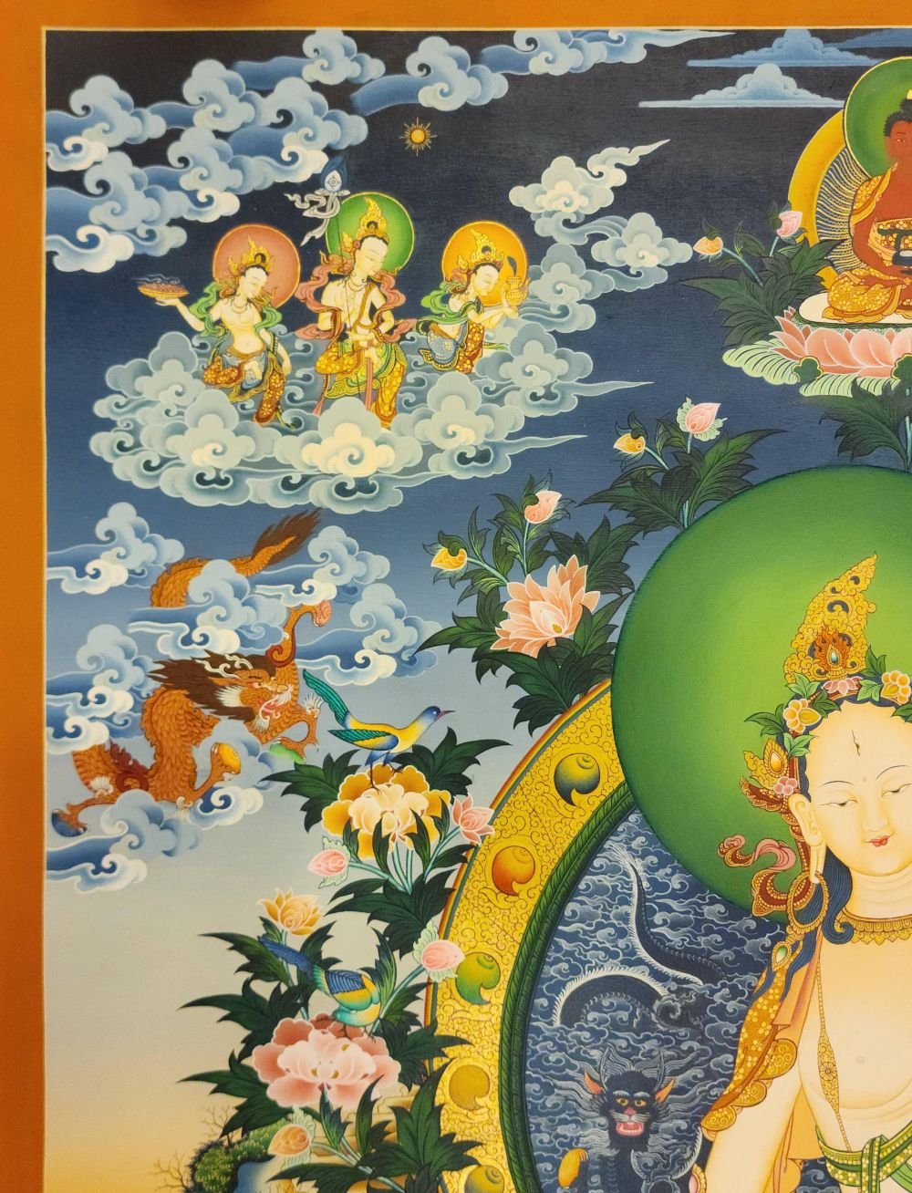 This thangka of White Tara has real gold painted on its surface along with other paints. This is an ancient process of decorating the thangka in Tibetan Buddhism, Here gold is ground into gold dust, which is then mixed with other undisclosed material to make it paintable on the canvas. this mixture is then mixed with transparent glue and painted on the thangka. Read More