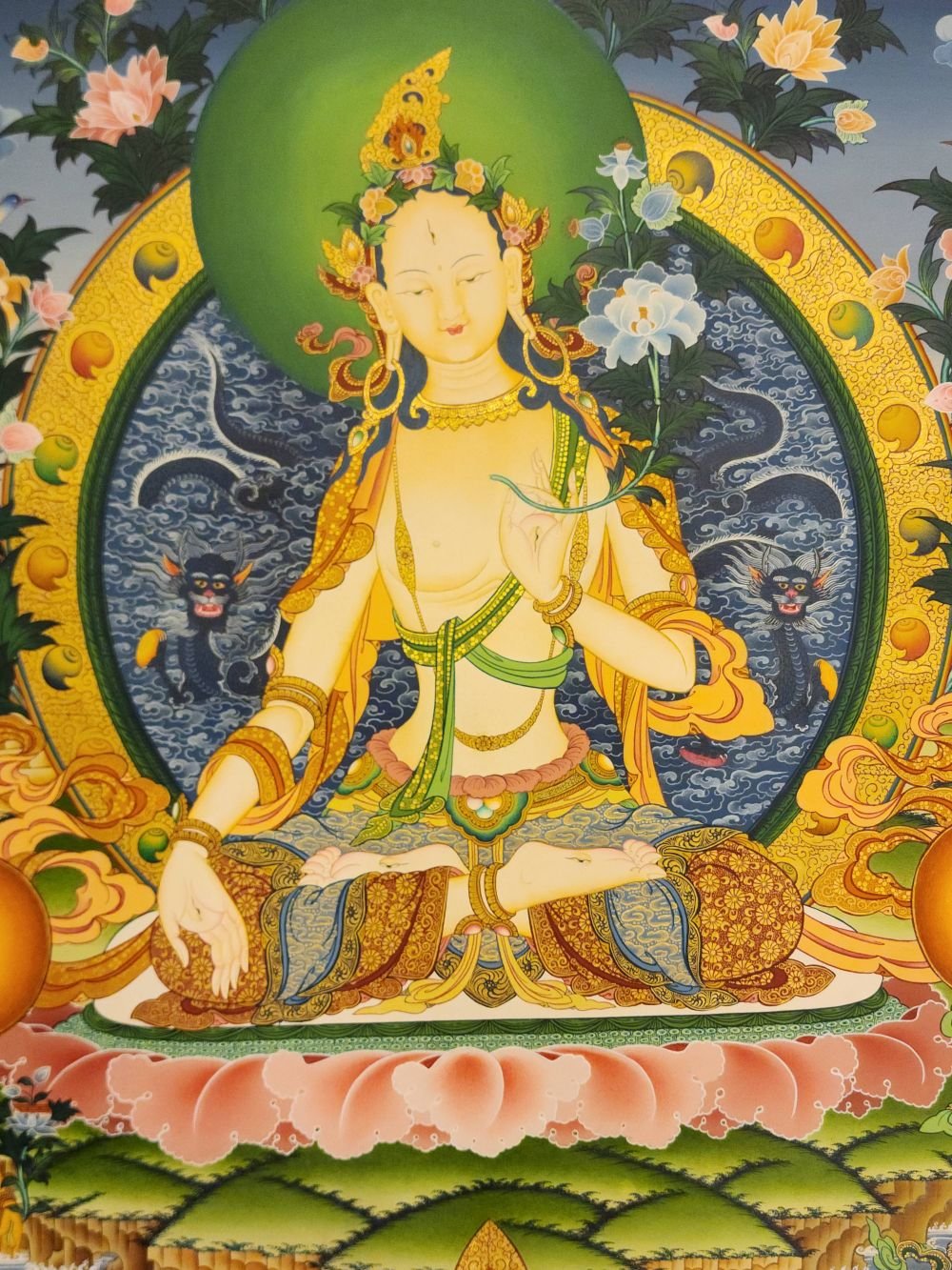 Her left hand is gracefully lowered in an empty open palm boon granting gesture [Skt. Varada Mudra]. White Tara has a blooming pink lotus & an unopened bud on either side of her body. The lotus in the painting is stylised as a peony & a chrysanthemum to provide artistic contrast with her lotus throne. The open blossom represents the present and the bud represents the future situations & Buddhas yet to be born. The future also refers to beneficial changes circumstances that she will help bring about. Her right hand wisdom hand is in the gesture of giving refuge [Skt. Sharanagamana]. The word refuge refers to the teaching of compassionate understanding which she imparts. The third finger touches the thumb to create a circle representing the union of wisdom and compassion, and the three extended fingers symbolise the Three Jewels of Buddhism A. The Buddha State B. The Body of teachings [Skt. Sangha] C. The Principles of the Universal form [Skt. Dharma]. The same hand holds the stem of a blue lotus [Skt. Utpala] representing change. The lower part of the stem below the bend represents the root of the lotus in the mud. The allegory of the Lotus refers to the something that grows from the obscurity of the mud & which eventually bursts open in the light. The lotus journey is one of inner awakening & enlightenment analogous to the human spirit. Buddhism shows us how to grow towards the light with profound teachings which help us to navigate away from burdens and sufferings which we may have by being materially minded, bitter & confused.