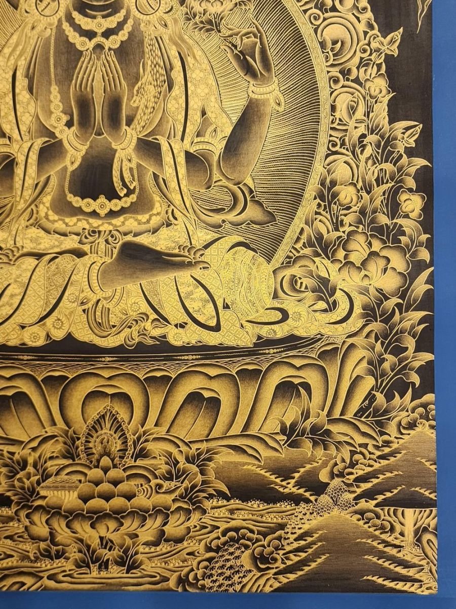 This thangka of Chenrezig has real gold painted on its surface along with other paints. This is an ancient process of decorating the thangka in Tibetan Buddhism, Here gold is ground into gold dust, which is then mixed with other undisclosed material to make it paintable on the canvas. this mixture is then mixed with transparent glue and painted on the thangka. Read More