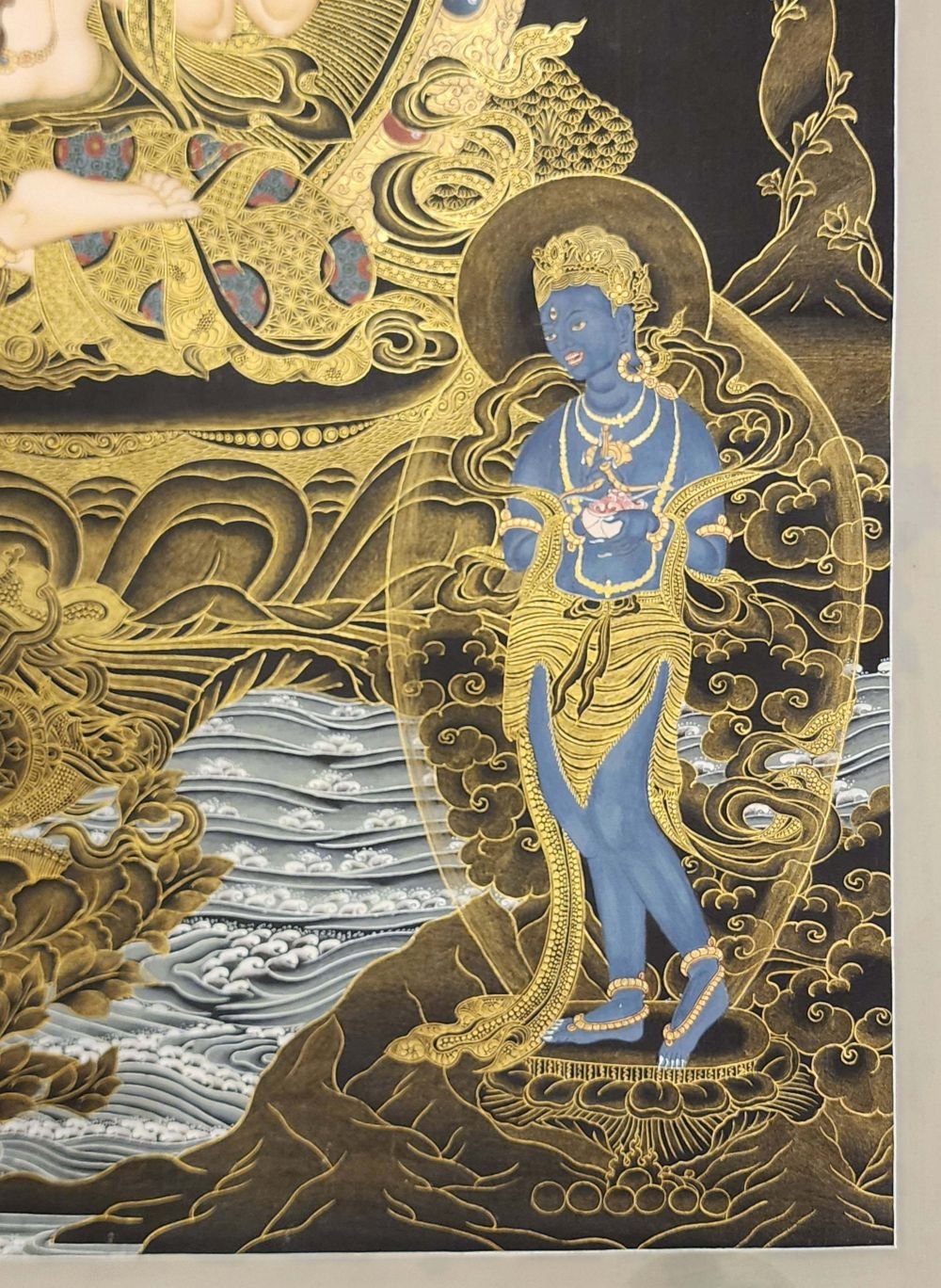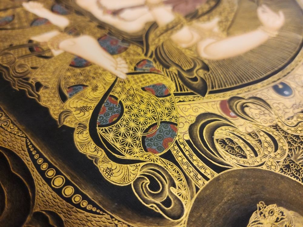 This thangka of Chenrezig has real gold painted on its surface along with other paints. This is an ancient process of decorating the thangka in Tibetan Buddhism, Here gold is ground into gold dust, which is then mixed with other undisclosed material to make it paintable on the canvas. this mixture is then mixed with transparent glue and painted on the thangka. Read More