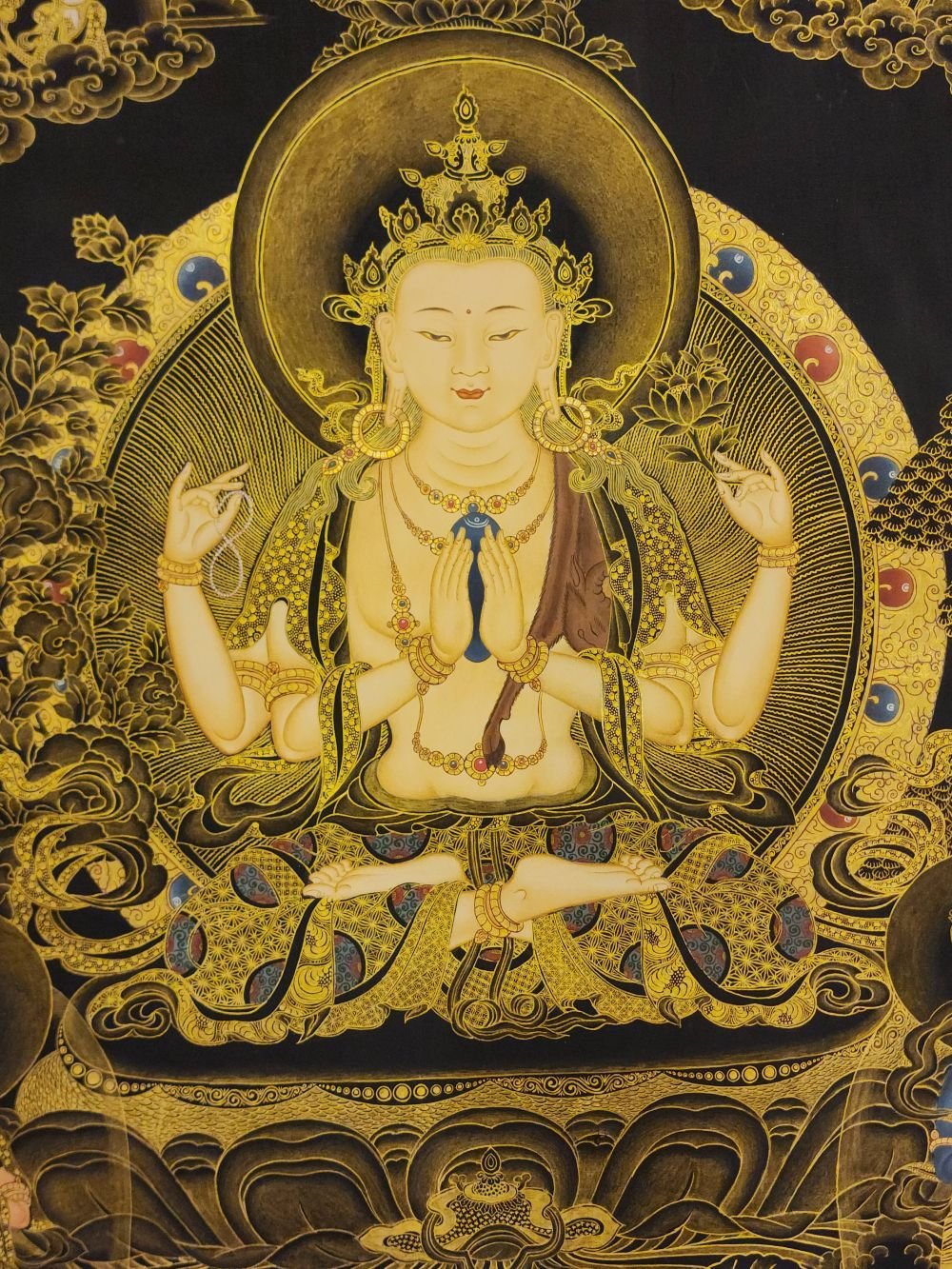 The first two, the inner arms, have palms joined at the heart, holding a sky-blue, and wish fulfilling jewel. This symbolizes that in whatever way Chenrezig manifests to benefit beings, the quality of Chenrezig's mind is never separate from the all-pervasive primal wisdom.