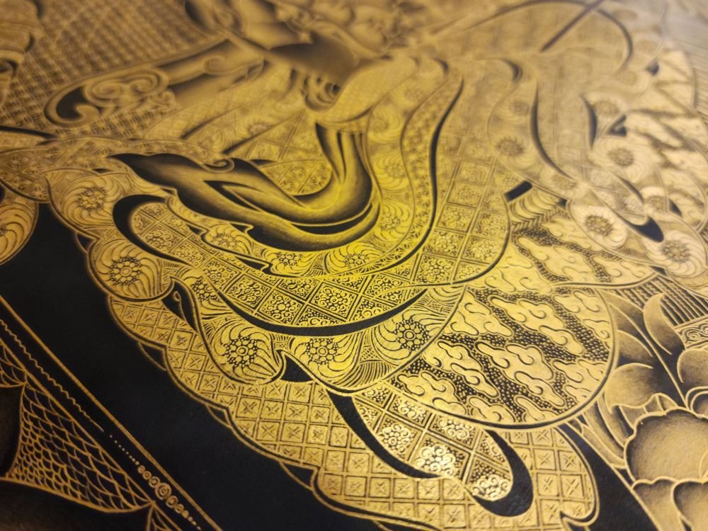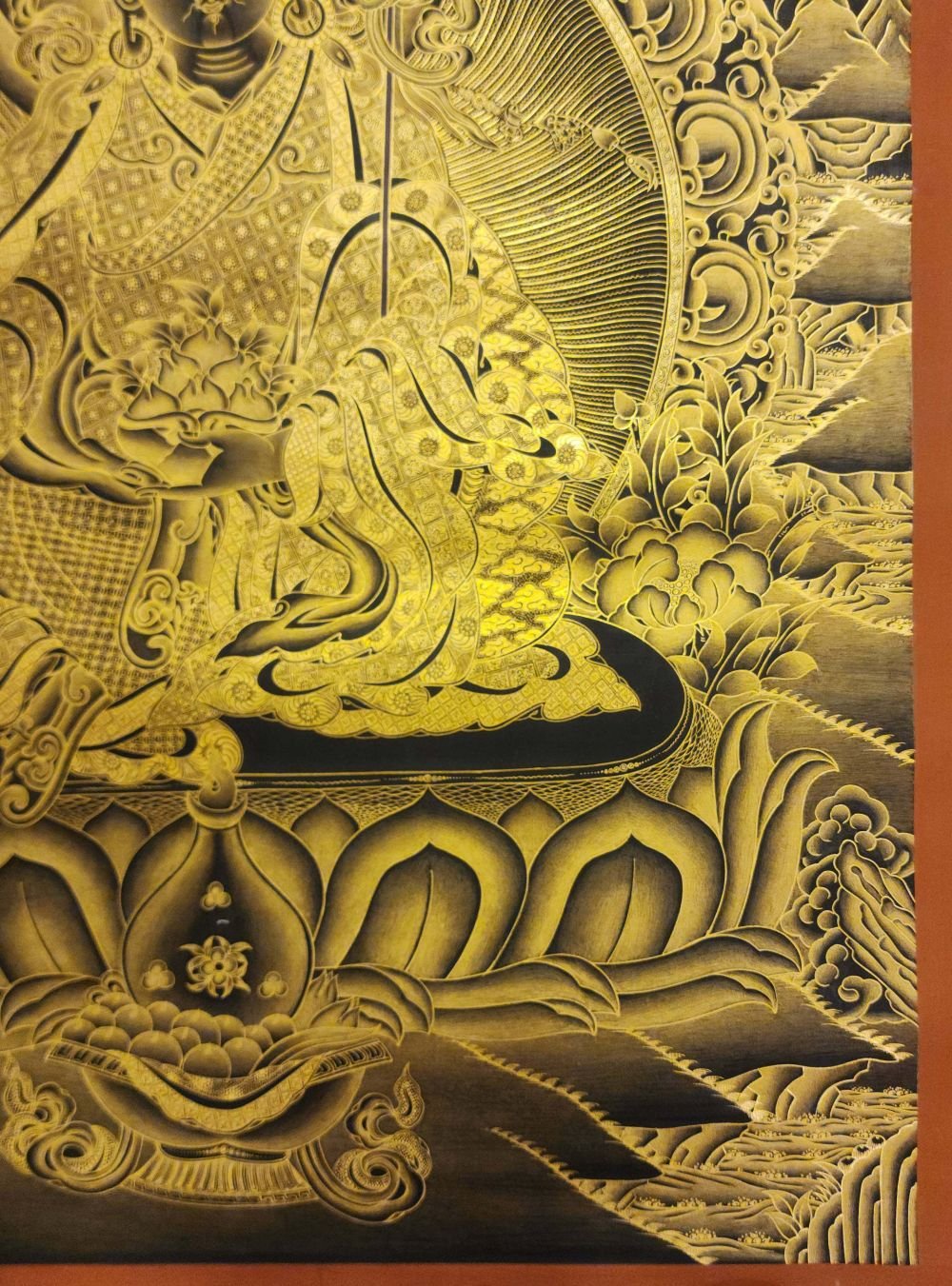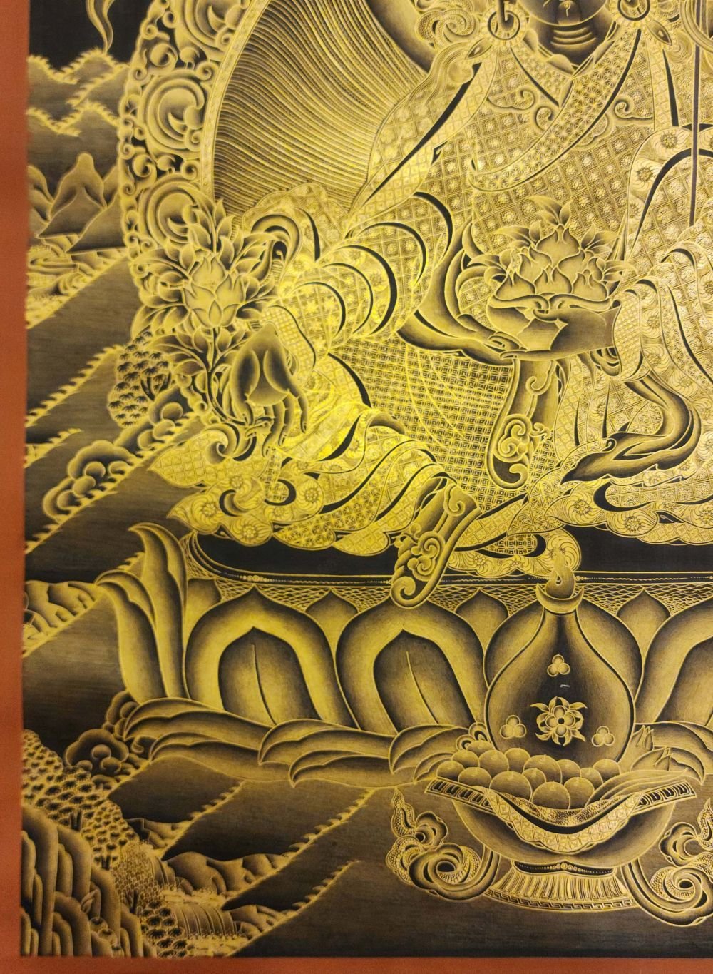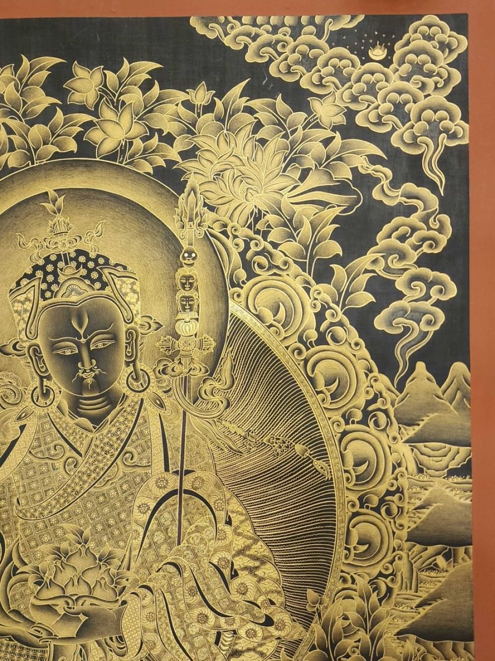 This thangka of Padmasambhava has real gold painted on its surface along with other paints. This is an ancient process of decorating the thangka in Tibetan Buddhism, Here gold is ground into gold dust, which is then mixed with other undisclosed material to make it paintable on the canvas. this mixture is then mixed with transparent glue and painted on the thangka. Read More