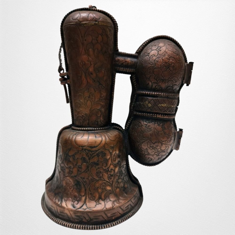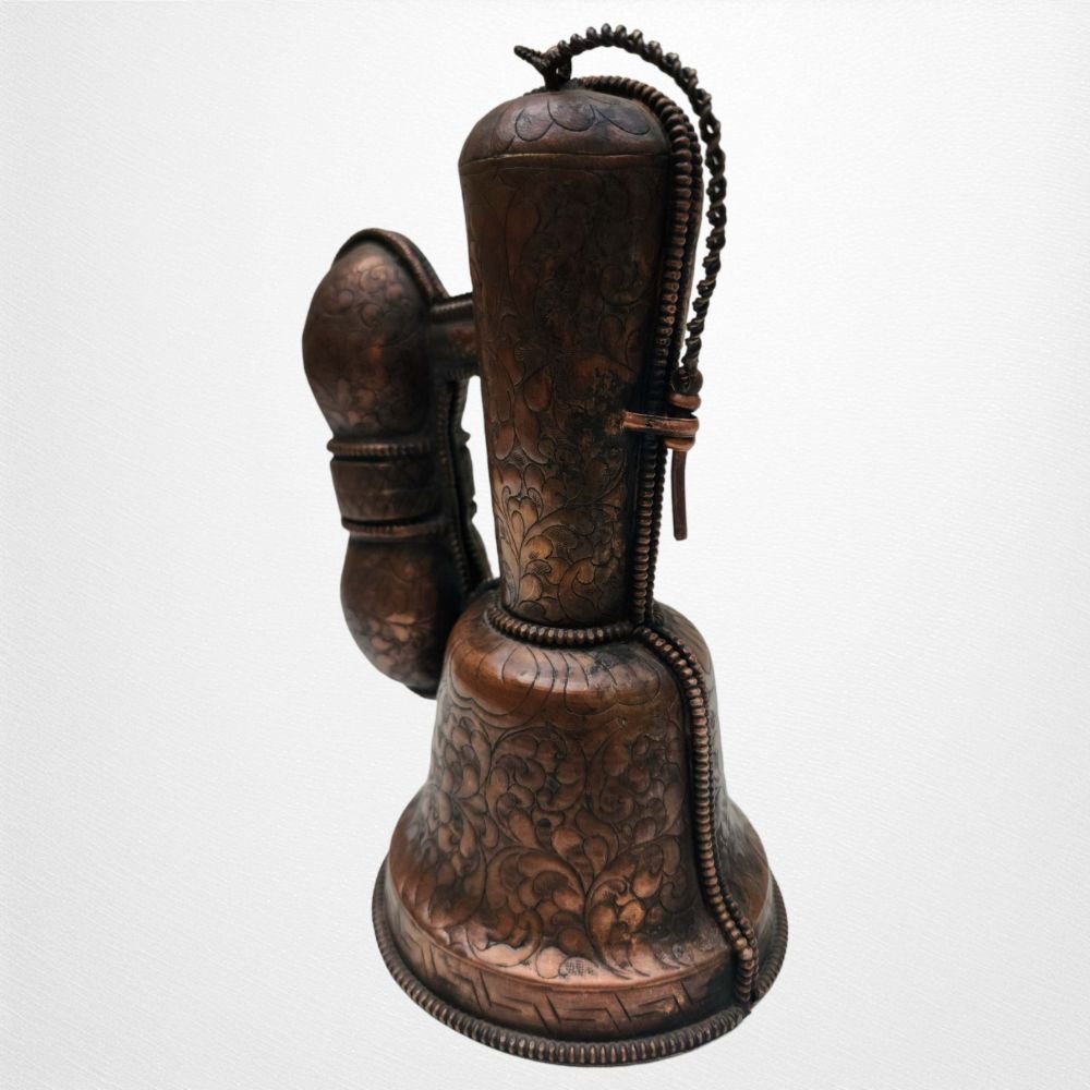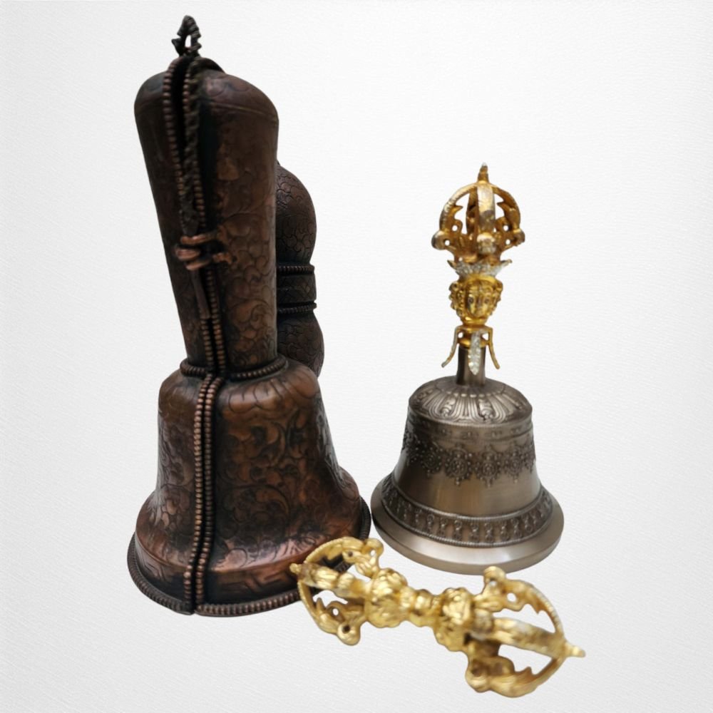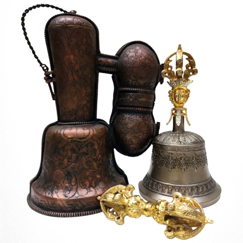 As the archetypal feminine principle the Dill boo [bell] represents the perfection of wisdom which directly perceives the primordial nature of shunyata [emptiness]. Its sound describes emptiness as it the sound arises from silence and dissolves back into silence. As such it represents the mandala of creation and dissolution; the bottom rim of the bell reps the disc of emptiness from which all arises, these being symbolised by the ring of lower dorjes, the garlands of hanging pearls, the upper horizontal dorjes, all forming the base for eight seed syllables of the eight goddesses. The main feature fo the handle is the face of Vajra-para-mita, the greatest Goddess representing the union and perfection of all wisdom and awareness. From her elaborate crown rise the five wisdom jewels which form the vajra cap to the bell.