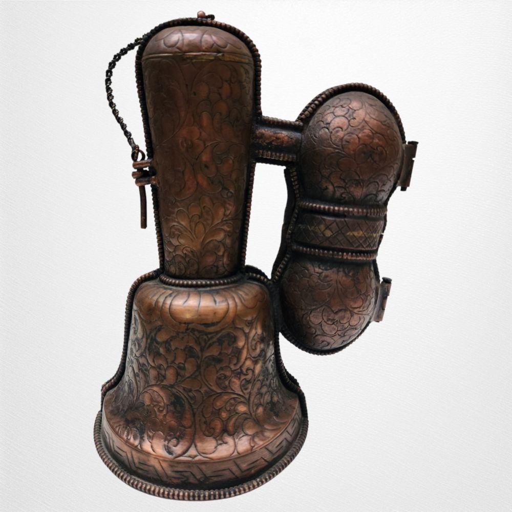 The bell, also known as a "drilbu" in Tibetan, is made from high-quality metal alloys, typically bronze or brass. It features a distinctive shape with a wide base that gradually tapers toward the top. The bell's body is adorned with intricate patterns, intricate carvings, and traditional motifs that reflect the rich cultural heritage of Tibet. These designs are often inspired by Buddhist symbols, mantras, or deities, adding a spiritual dimension to the bell's aesthetics. Read More