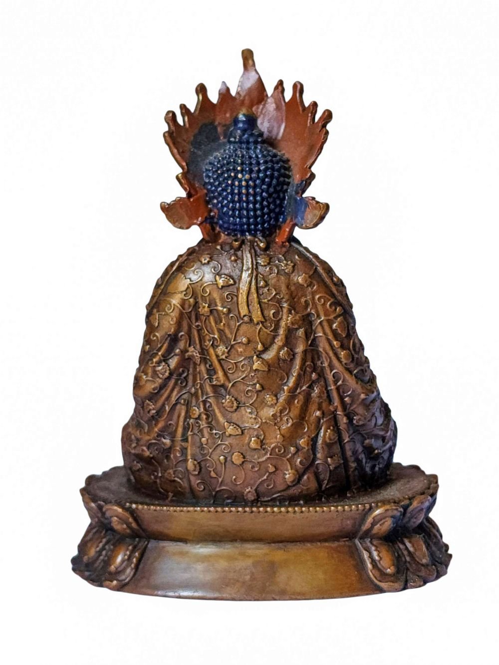 This Dipankara Buddha has been meticulously treated with a chocolate color antique patina. The intention behind this patina is to replicate the appearance of a copper statue that has gracefully aged over a century. Unlike a simple coat of paint, this patina is not applied superficially and is designed to endure. It undergoes an artificial oxidation process that adds depth and character, while also serving as a protective layer against natural oxidation.