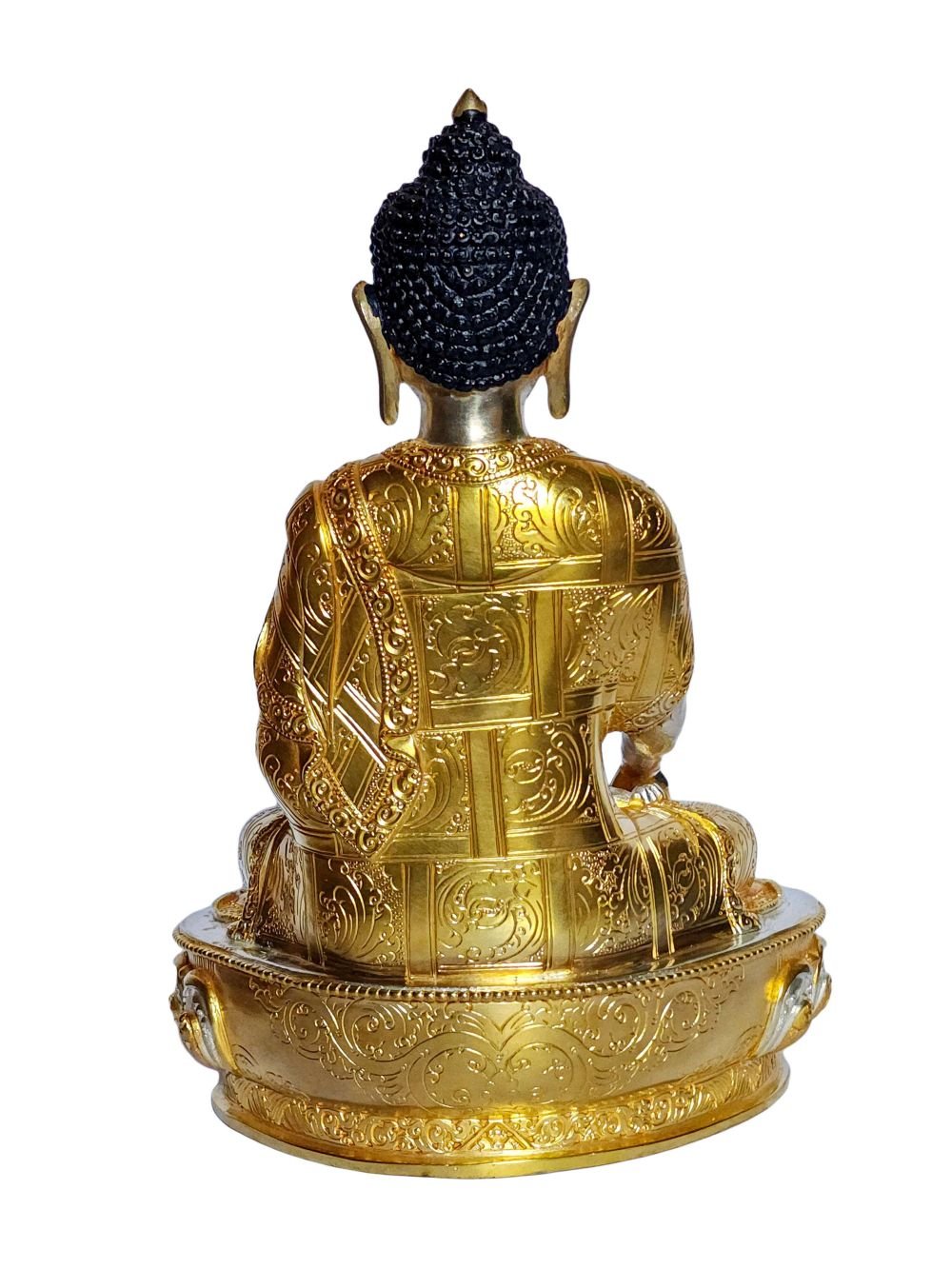 This Shakyamuni Buddha has a Partly gold-plated finish. Partly fire gold gilding, a common practice in Nepali handicrafts. This technique is skillfully employed by artisans to create intricate designs on various metal objects, including statues, jewelry, and decorative items. Through a process, a mask or resist is applied to safeguard specific areas from the gold plating. The object is then subjected to high temperatures, allowing the gold to beautifully adhere to exposed surfaces using a combination of heat and pressure.