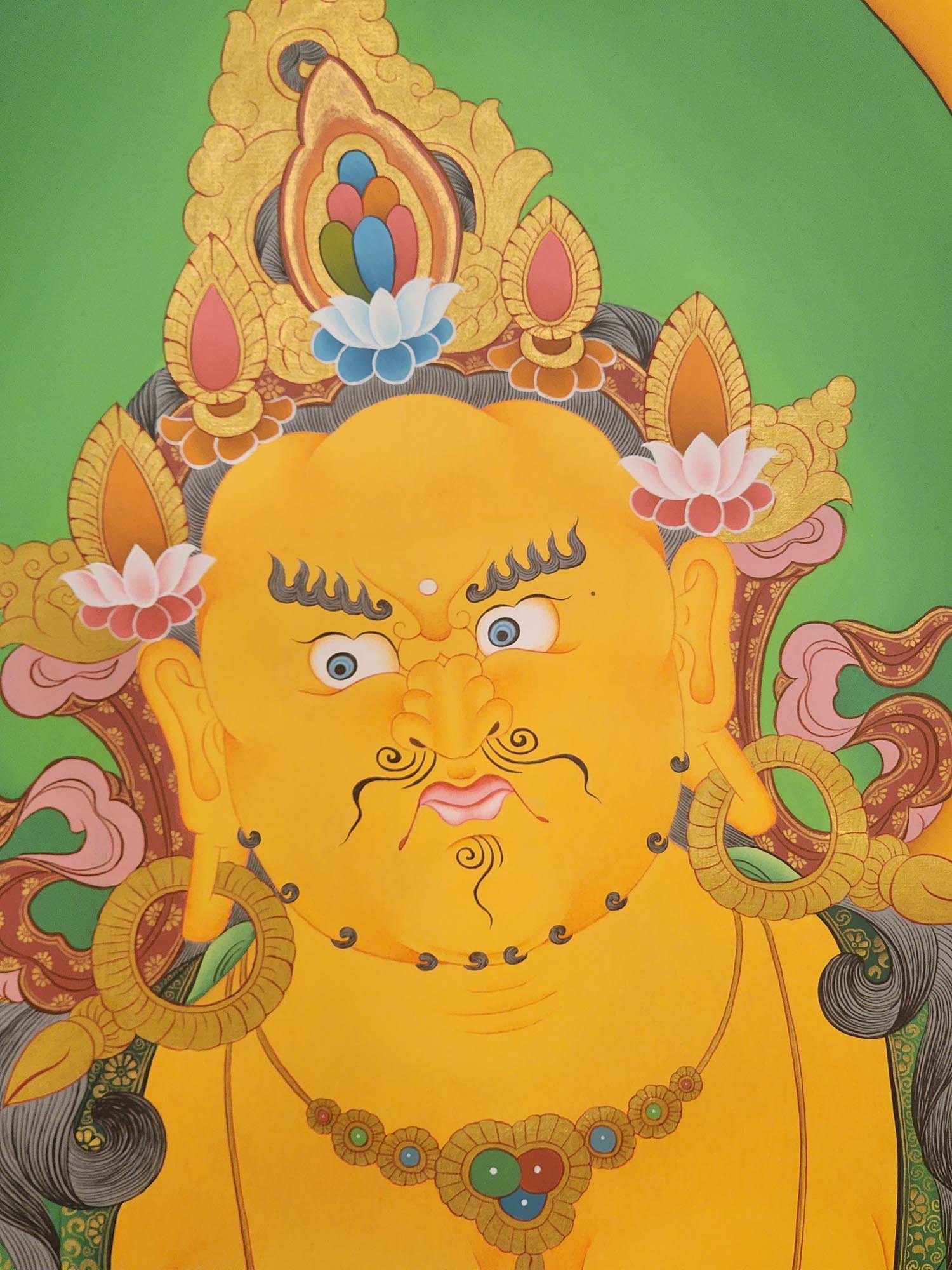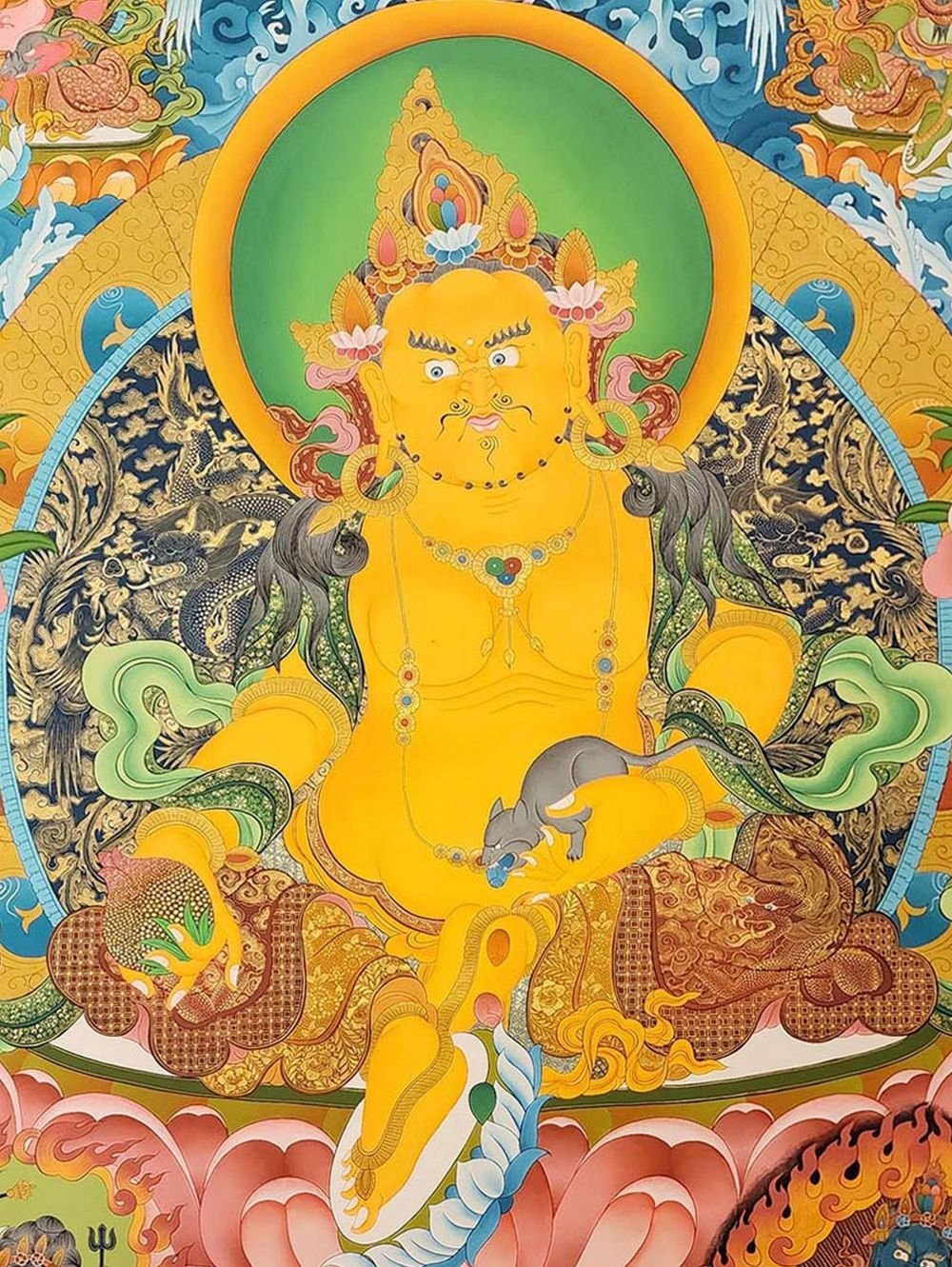 Yellow Jambala is the manifestation of Buddha Ratnasambhava. He protected the dharma and if anyone calls his name, he will come and help the person. If one has trouble with finance or anything, one can chant his mantra and he will come and help. But one must have a bodhi mind and practice Buddhism properly to attain his blessings. One can also gain wealth, wisdom, intelligence, and at last! Attain Buddha hood!. Yellow Jambala sits on a lotus, sun, and moon disk. He holds a mongoose in his left hand and from its mouth spews forth precious jewels.