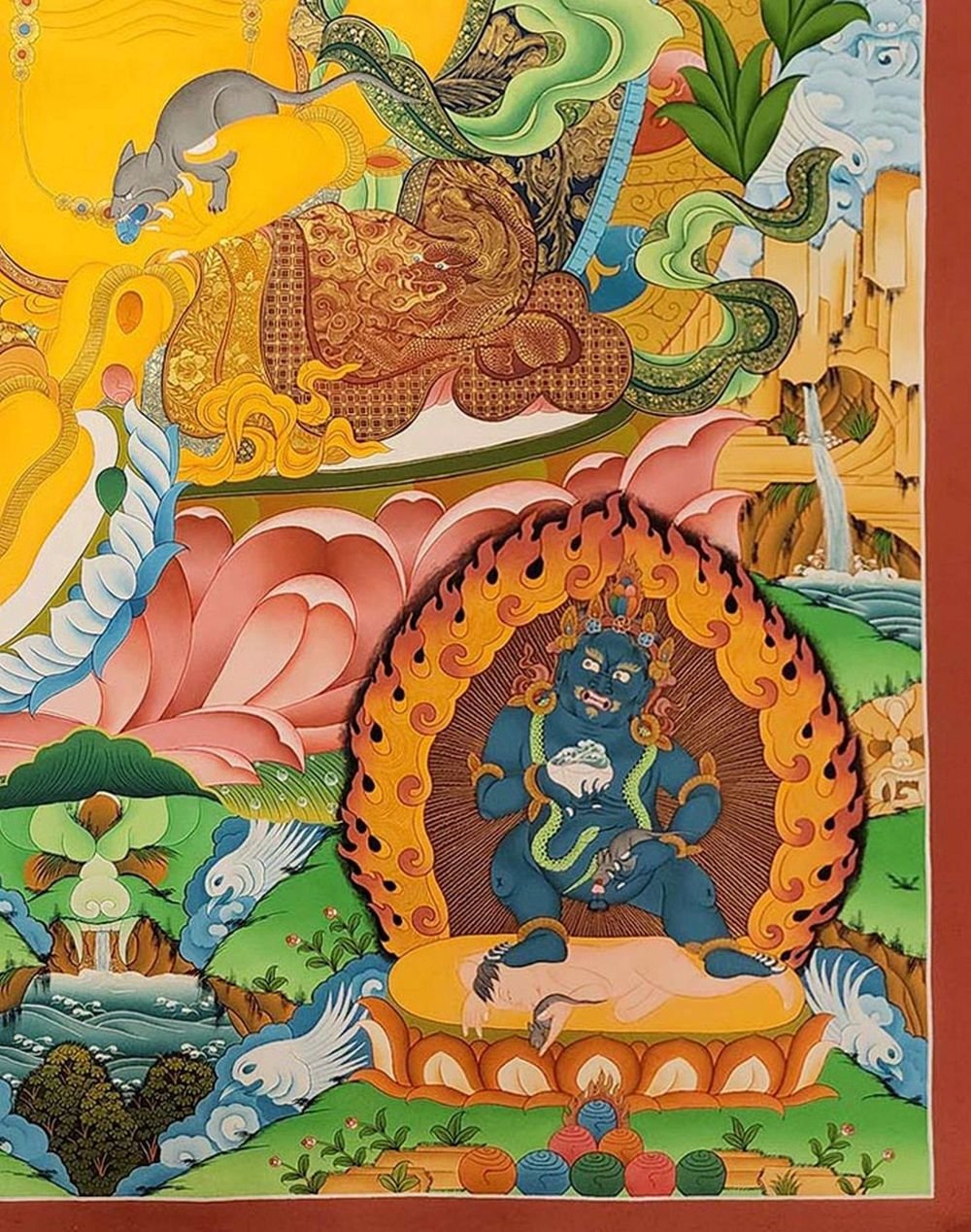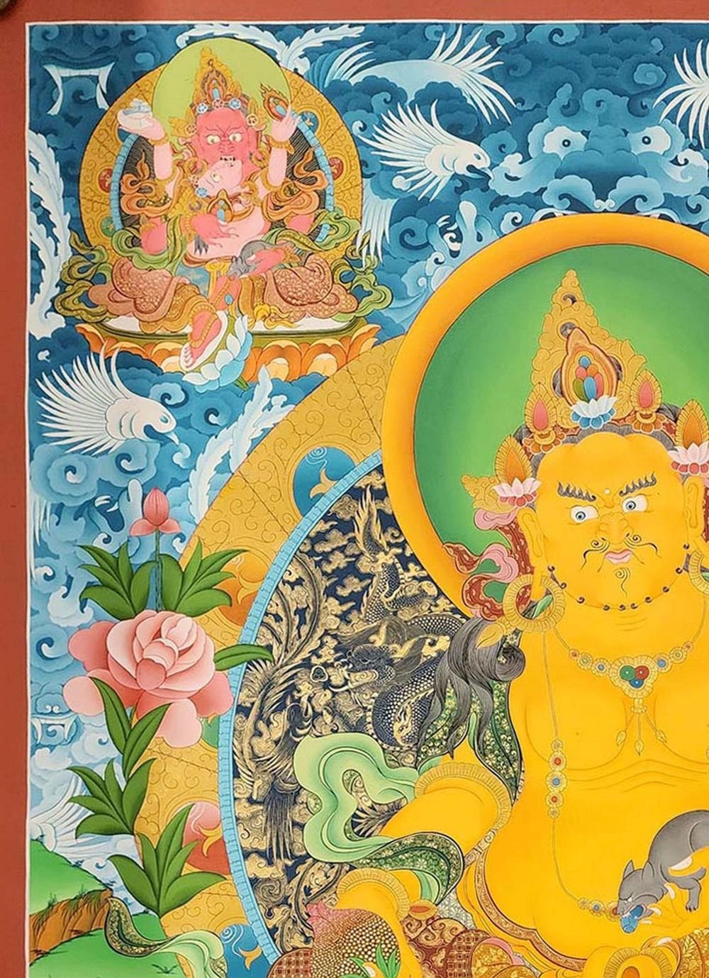 This thangka of Five Jambhala has real gold painted on its surface along with other paints. This is an ancient process of decorating the thangka in Tibetan Buddhism, Here gold is ground into gold dust, which is then mixed with other undisclosed material to make it paintable on the canvas. this mixture is then mixed with transparent glue and painted on the thangka. Read More
