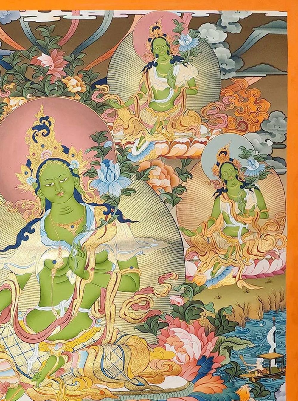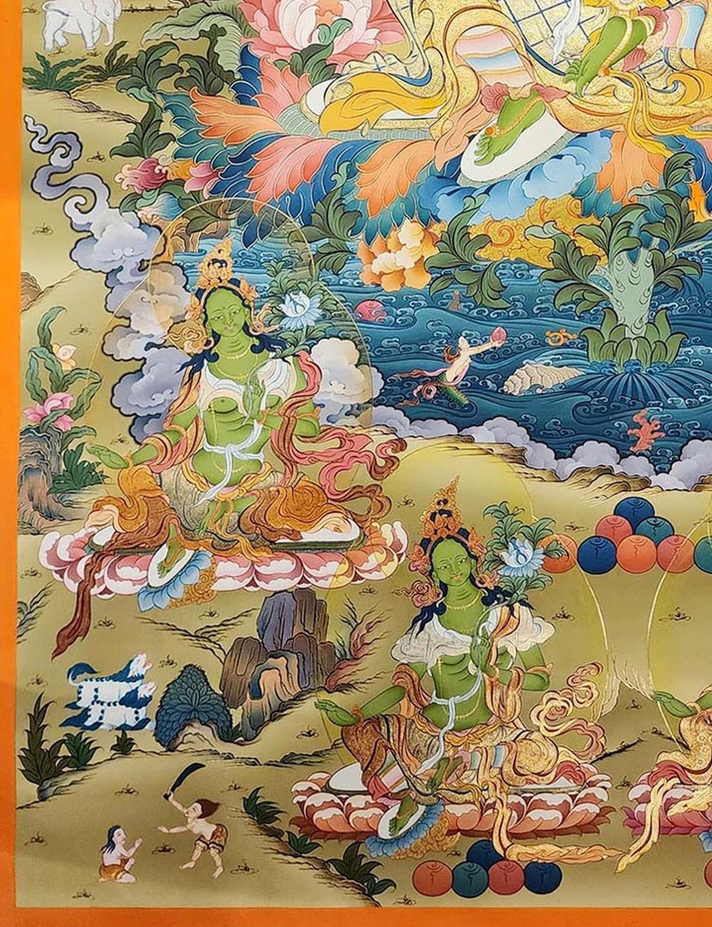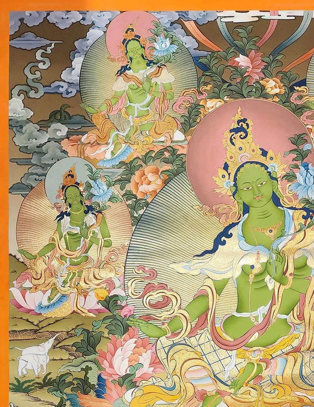 Green Tara Thangka, Tibetan Buddhist Art, Hand Painted, Real Gold , Goddess of Compassion, Protection, and Swift Action