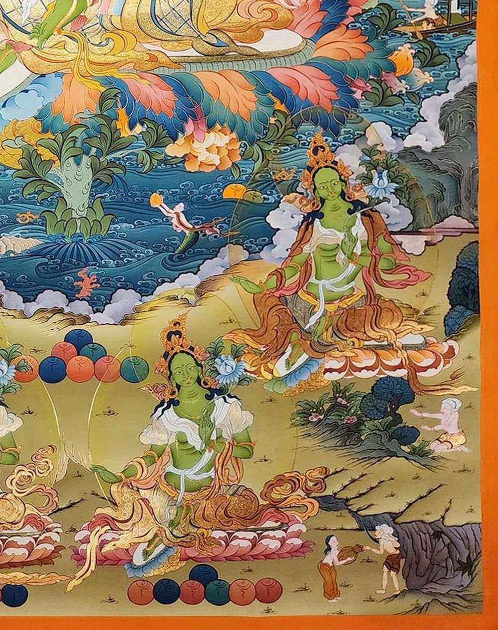This thangka of Green Tara has real gold painted on its surface along with other paints. This is an ancient process of decorating the thangka in Tibetan Buddhism, Here gold is ground into gold dust, which is then mixed with other undisclosed material to make it paintable on the canvas. this mixture is then mixed with transparent glue and painted on the thangka. Read More