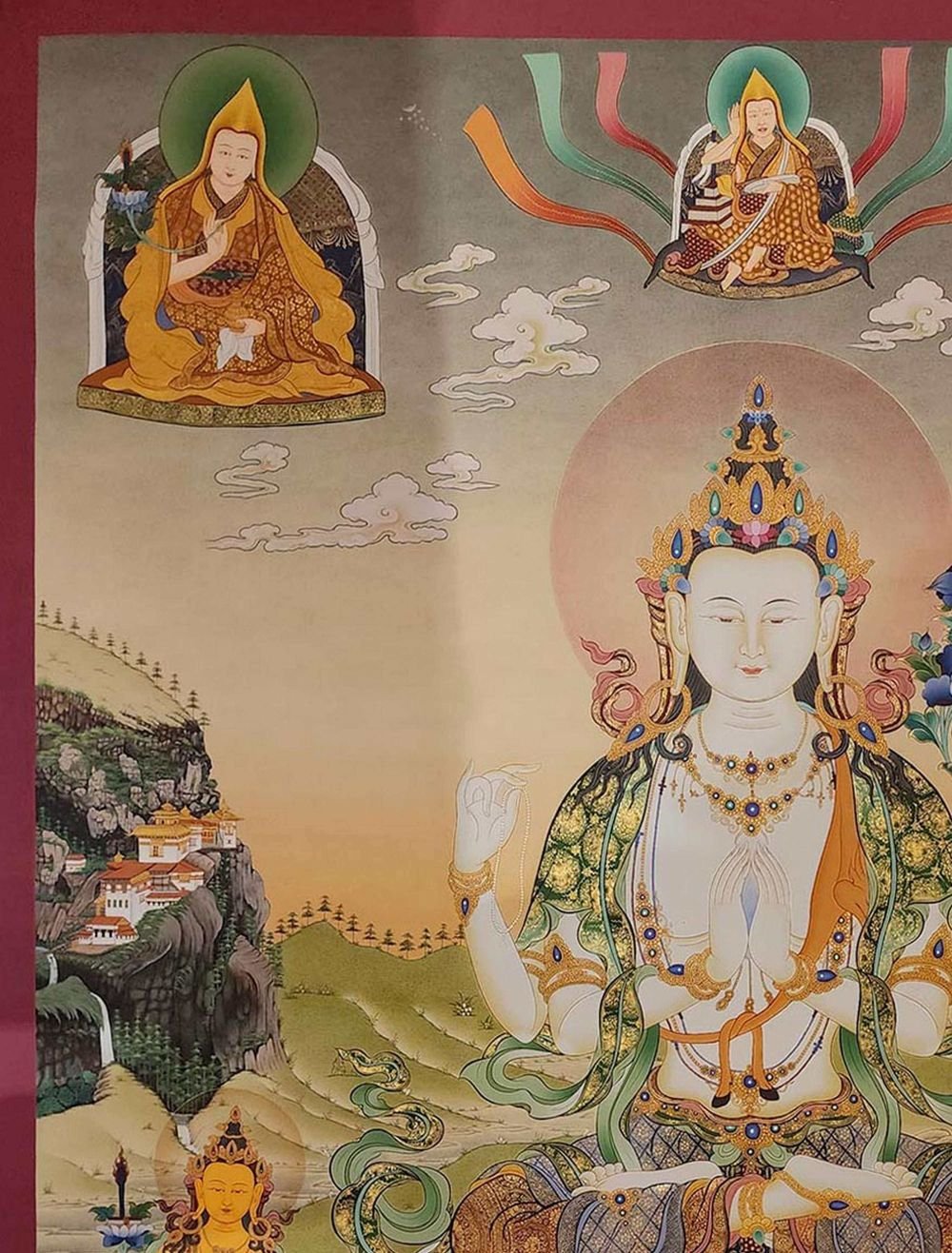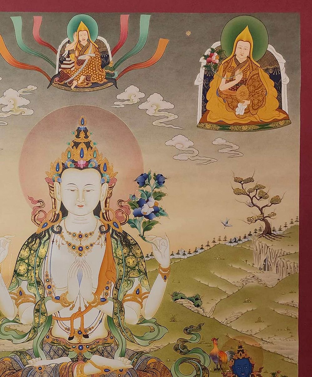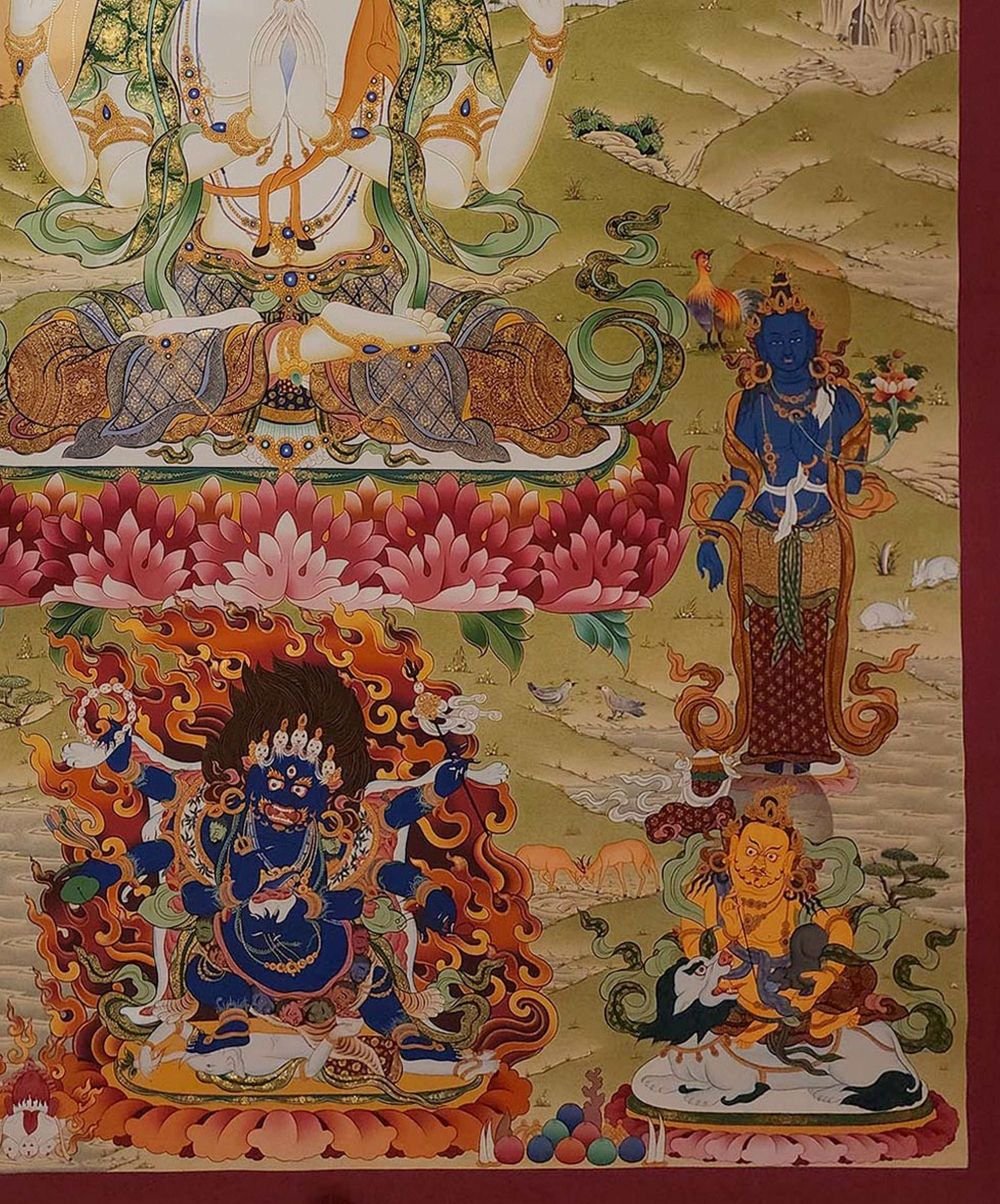 Chenrezig Thangka, Tibetan Buddhist Art, Hand Painted, Real Gold, Three Great Bodhisattvas Including Various Other Protectors and Teachers , Bodhisattva of Compassion, Protector of All Beings