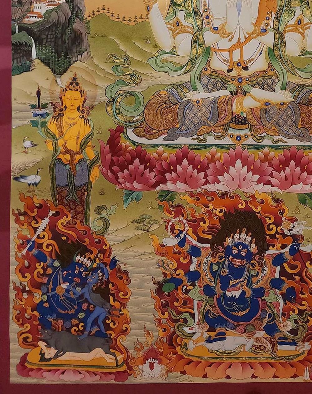 This thangka of Chenrezig has real gold painted on its surface along with other paints. This is an ancient process of decorating the thangka in Tibetan Buddhism, Here gold is ground into gold dust, which is then mixed with other undisclosed material to make it paintable on the canvas. this mixture is then mixed with transparent glue and painted on the thangka. Read More