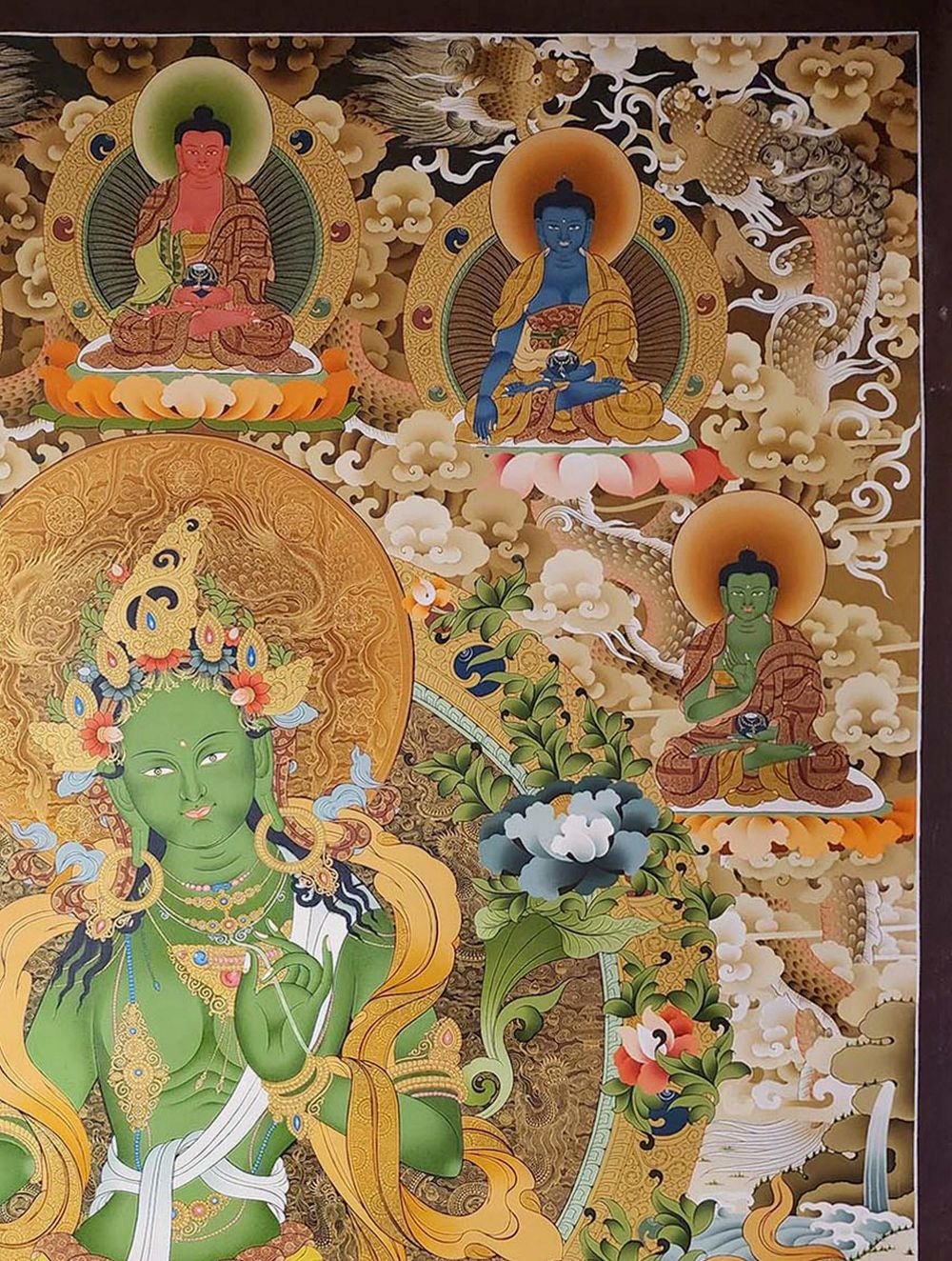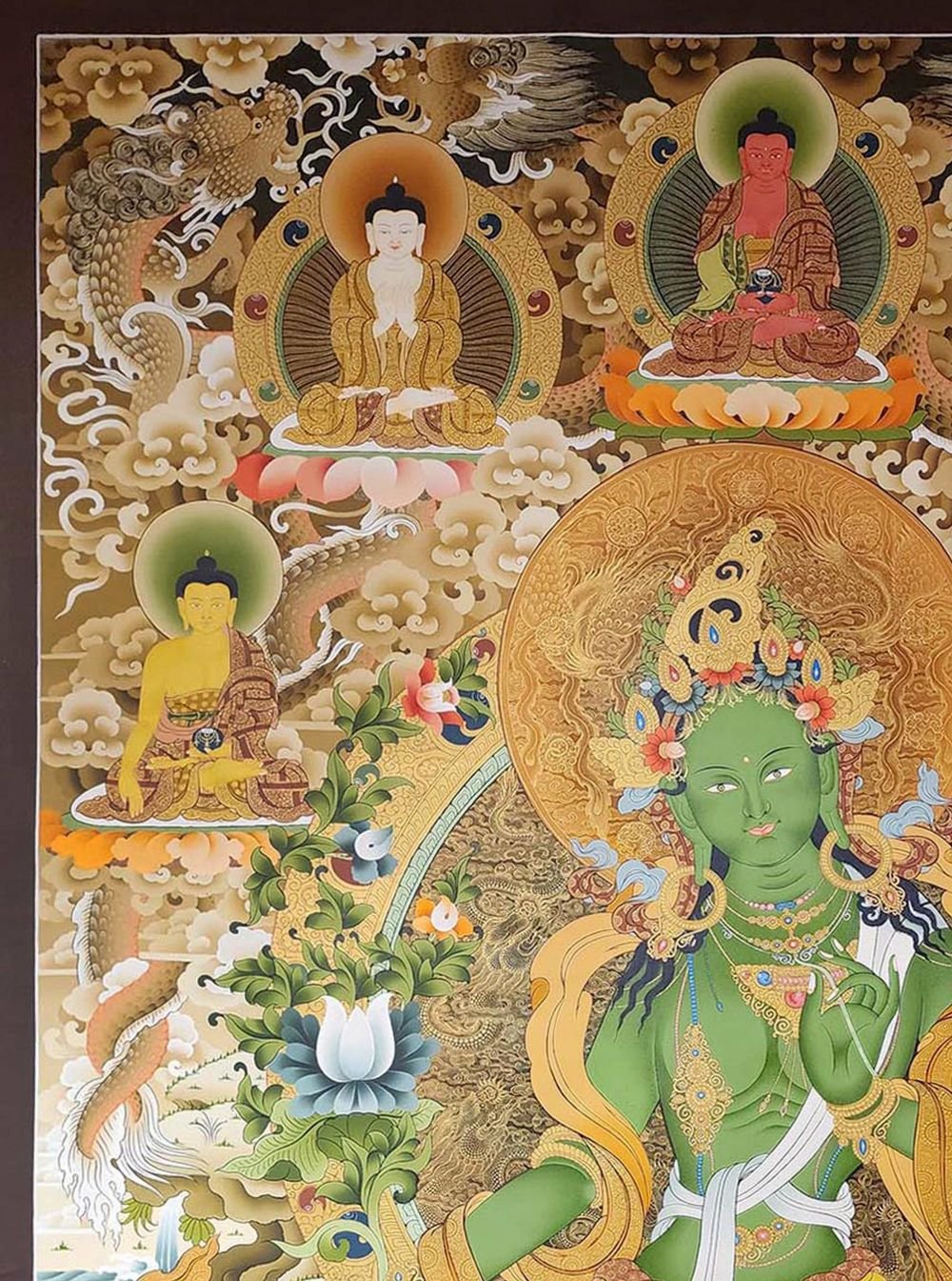 Green Tara, Tibetan Buddhist Art, Hand Painted, Real Gold, Three Goddess of Divine Grace and Pancha Buddha , Goddess of Compassion, Protection, and Swift Action