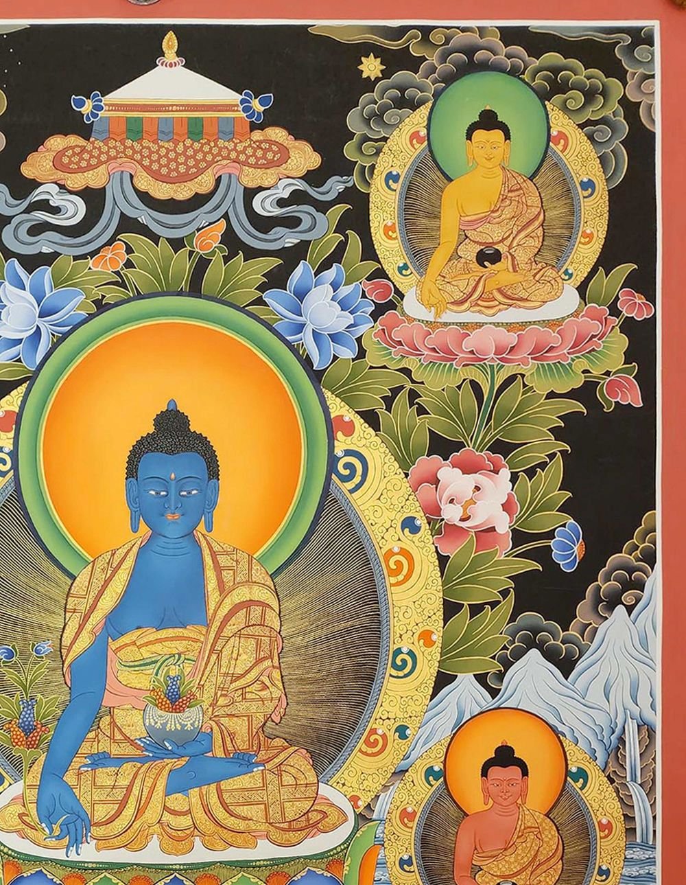 Medicine Buddha Thangka, Tibetan Buddhist Art, Hand Painted, Real Gold , Healer of physical and spiritual ailments, bringer of health and peace
