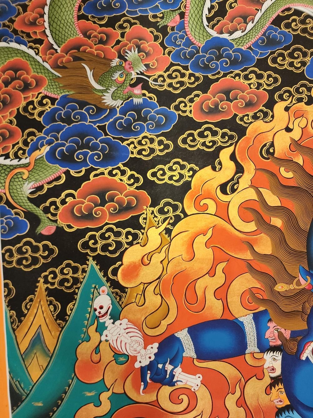 Yama is an ancient Vedic deity. His name comes from the root Ya meaning 'twin' in the sense of to restrain or bound. In Tibet Yama is usually Dam Can Chos rGyal, 'The Pledge Bound Dharma-King'. The later alludes to his conversion to Buddhism by Manjusri, the Bodhisattva of Wisdom in his wrathful manifestation as Yamantaka 'the Destroyer of Yama". There are three common forms of Yama that occur in Tibetan Buddhism which are called respectively the External, Internal, and Secrete Yama. This painting depicts the External or Outer form of Yama who is a Dharma protector invoked to protect devotees from mundane difficulties such as physical illness and hunger. He is the colour blue and is shown in the characteristic fierce standing pose of a protective deity with a pot belly and erect penis. He has the head of a fierce bull with sharply pointed horns and protruding blood shot eyeballs. The bull is an ancient symbol in Indic religions that is associated with Yama and death, but also can symbolize procreation. This ambivalent symbolism is understood in the Buddhist context as the overcoming of death to create eternal life. Yama is personified as a bull as a metaphor of the uncontrolled mind that one must learn to control to overcome death. In his role as lord of hell, Yama should not be confused with Western religious notions of the Devil as the embodiment of evil but as a deity given a task within the greater Buddhist cause of the salvation of all living beings. In Buddhist symbolic terms the overcoming of death by terminating the cycle of rebirth is the ultimate goal and it is Yama who serves as a transformer in that process by embodying impermanence.