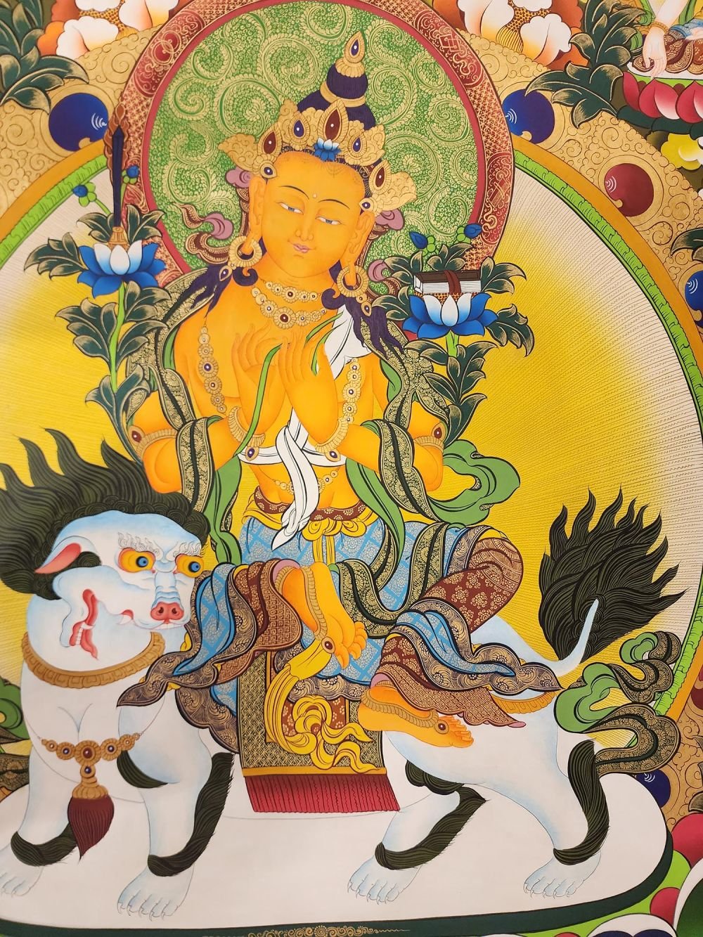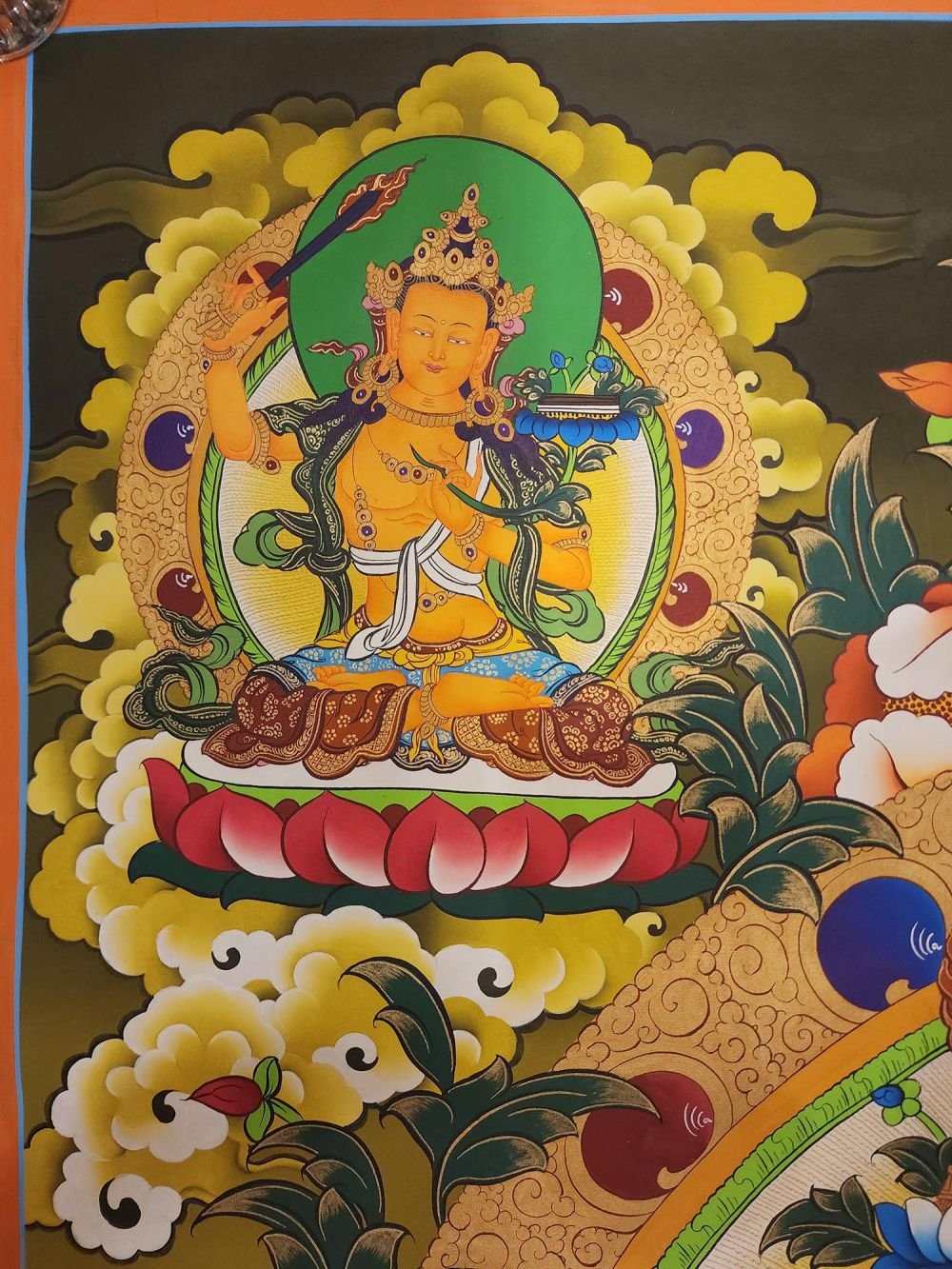 This thangka of Maha Manjushri has real gold painted on its surface along with other paints. This is an ancient process of decorating the thangka in Tibetan Buddhism, Here gold is ground into gold dust, which is then mixed with other undisclosed material to make it paintable on the canvas. this mixture is then mixed with transparent glue and painted on the thangka. Read More