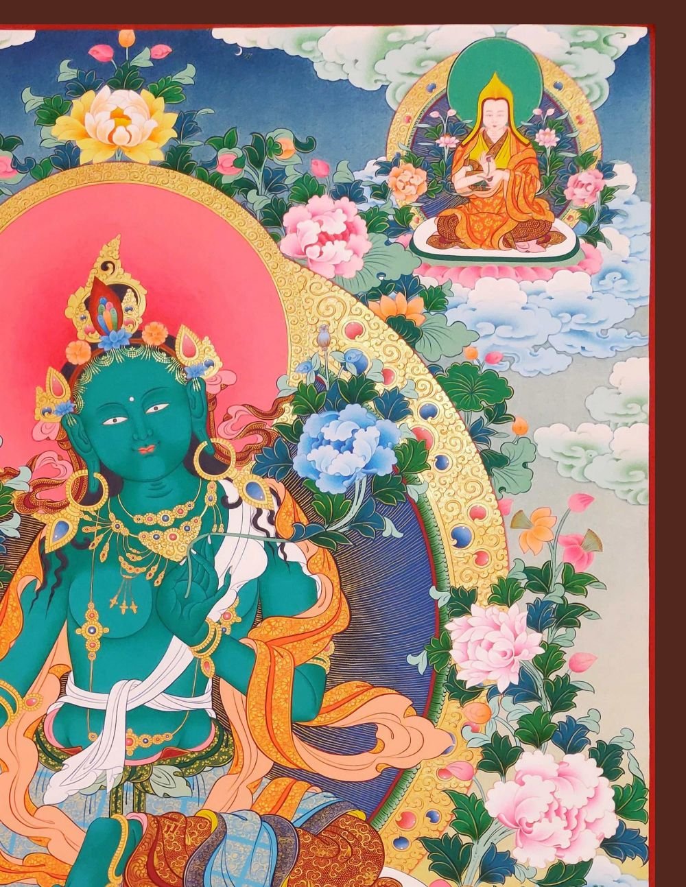 Green Tara Thangka, Tibetan Buddhist Art, Hand Painted, Real Gold , Goddess of Compassion, Protection, and Swift Action