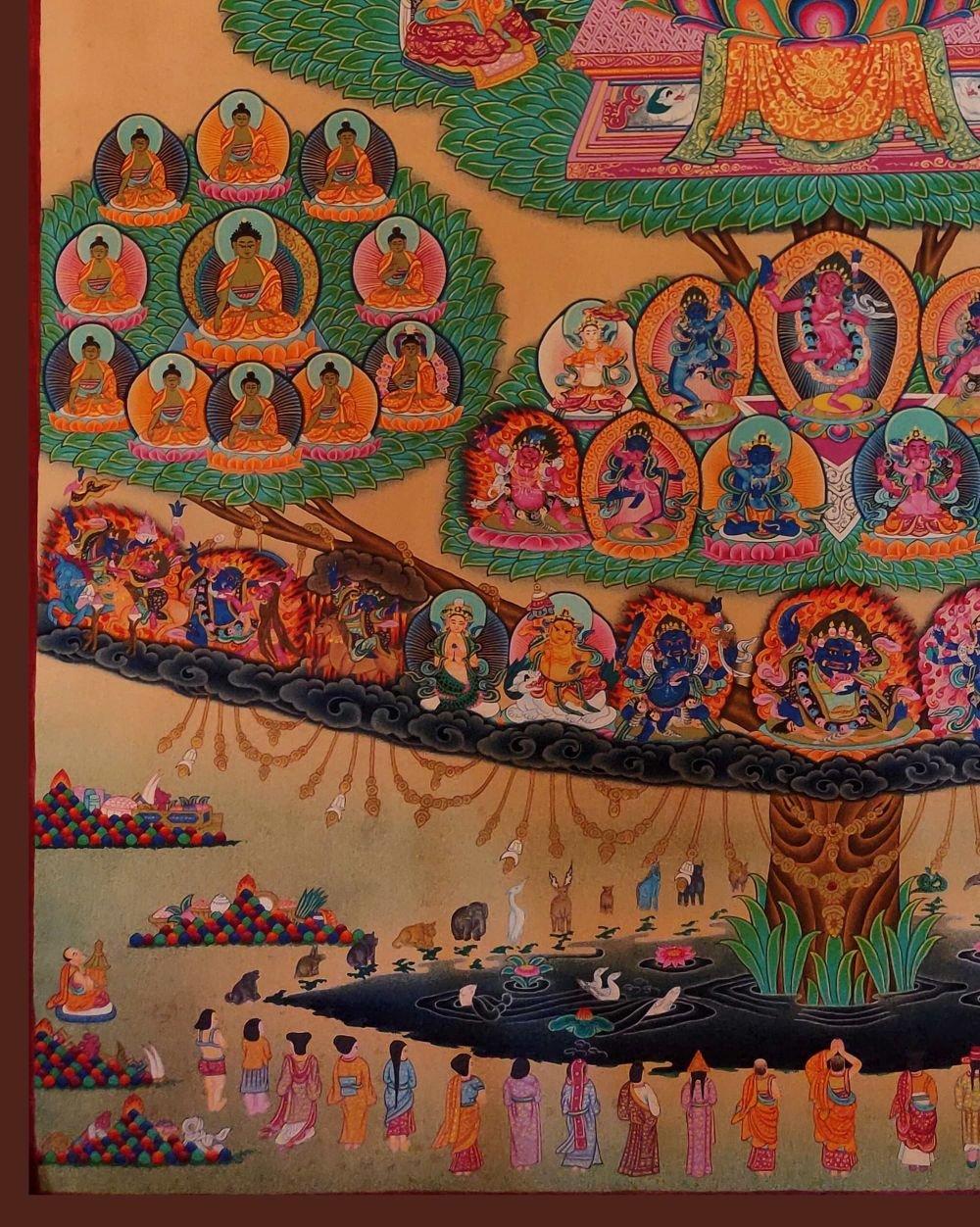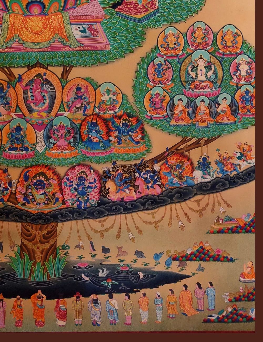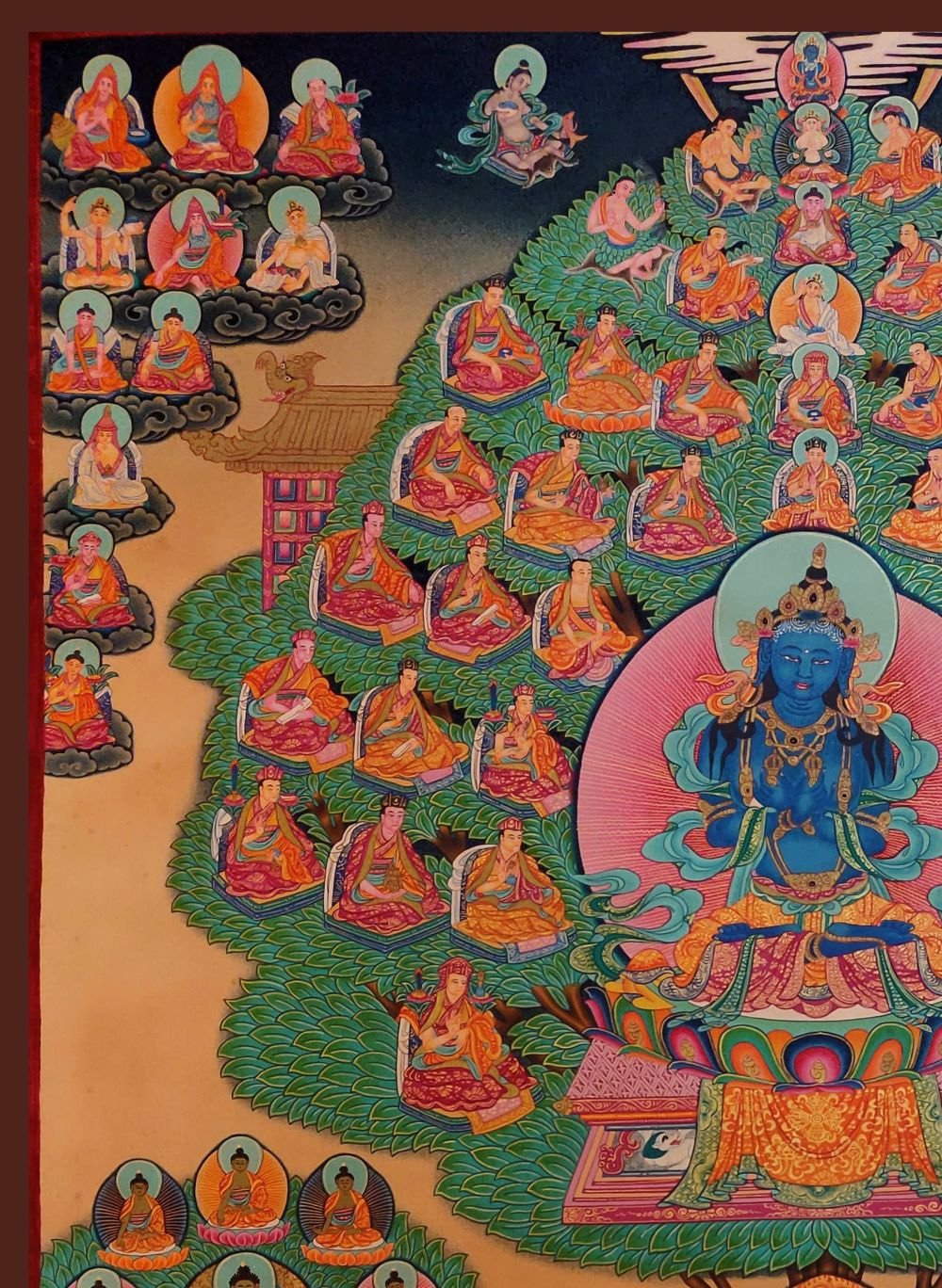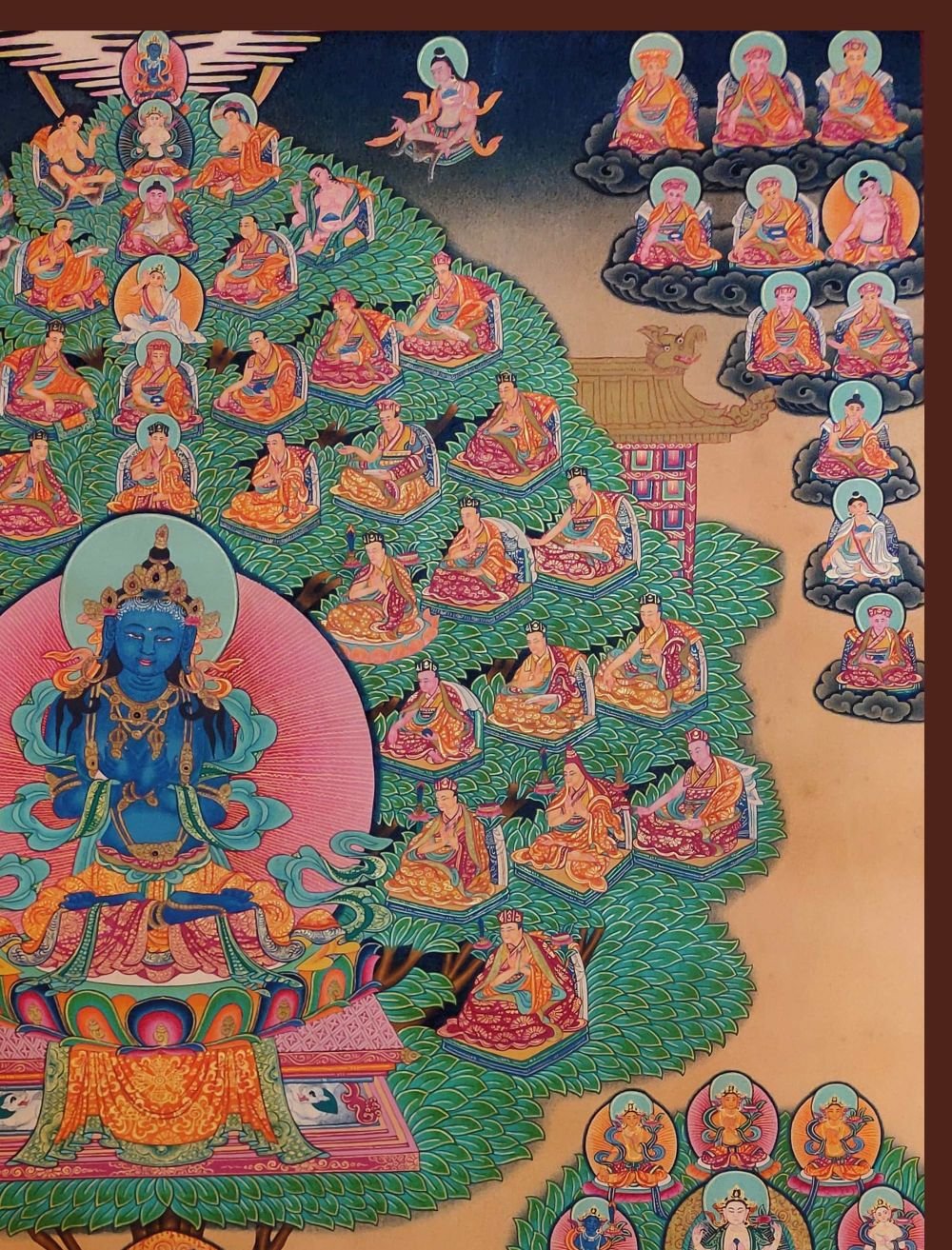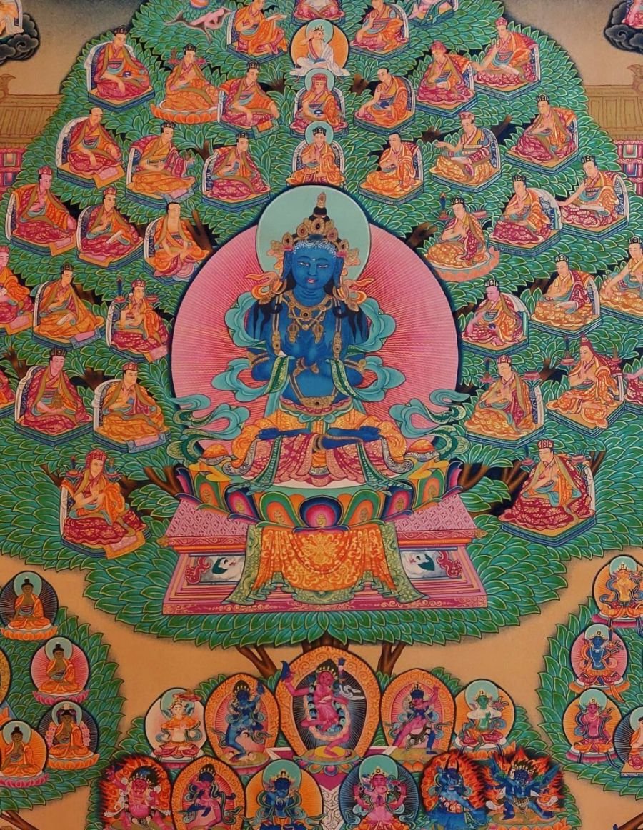 : Brief IntroductionA Vajradhara Refuge Tree is a Tibetan thangka that depicts the lineage of teachers and lineages of refuge within the Vajrayana tradition of Tibetan Buddhism. The tree is rooted in a deep blue sea, which represents the ocean of samsara, or cyclic existence. The trunk of the tree represents the path to enlightenment, and the branches and leaves represent the different lineages of teachers and teachings that lead to enlightenment.