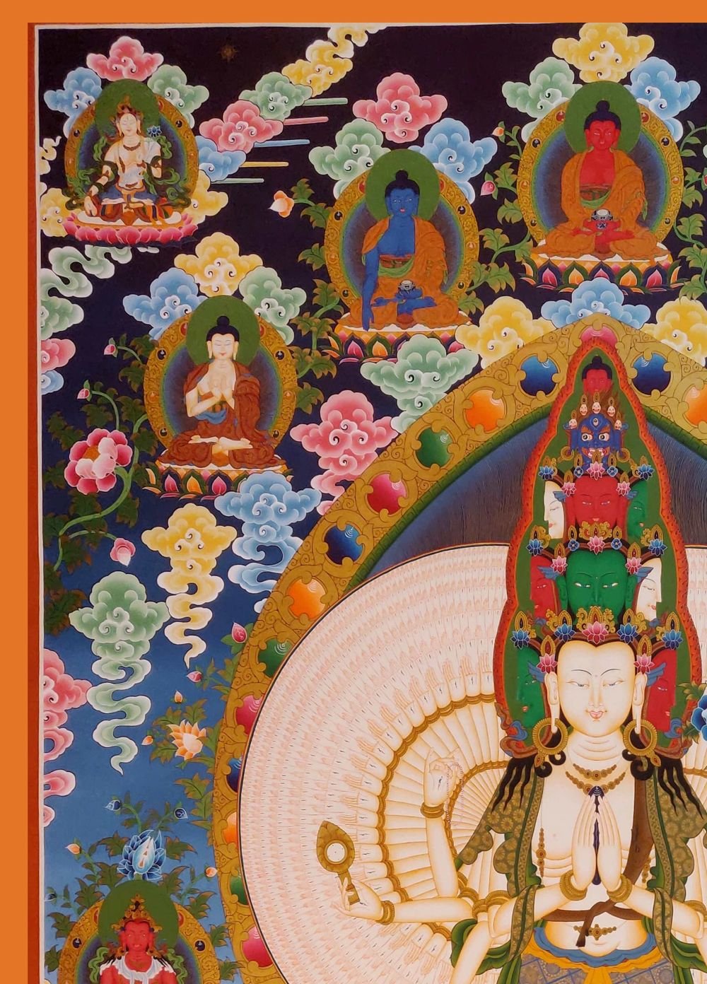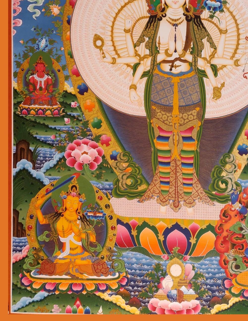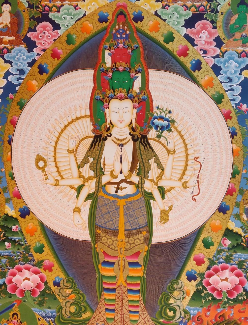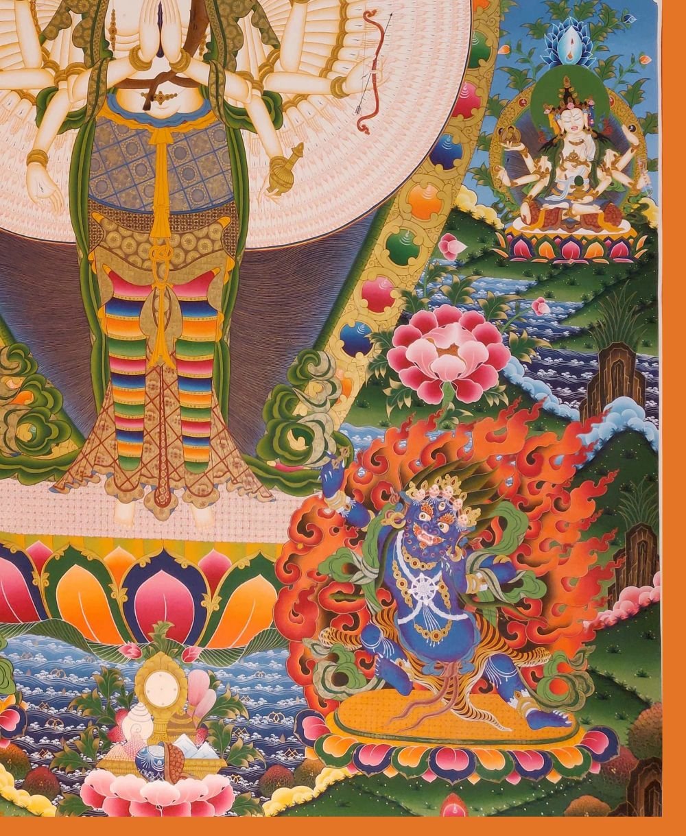 Sahasrabhuja Avalokiteshvara the Thousand-Armed, Thousand-Eyed form of Avalokiteshvara, the Bodhisattva of Infinite Compassion. Each of the 1,000 hands represents his boundless ability to help all sentient beings, while the eye in each palm symbolizes wisdom and omnipresent awareness.