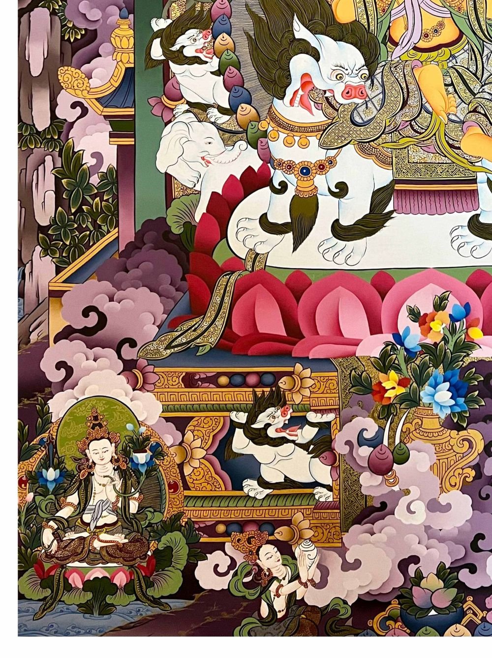 Yellow Manjushri: Yellow Manjushri represents the illuminating wisdom that dispels ignorance. Yellow symbolizes clarity and knowledge. Yellow Manjushri is often depicted seated on a lion's throne, holding a flaming sword and a book, symbolizing the wisdom that cuts through the confusion and leads to enlightenment.