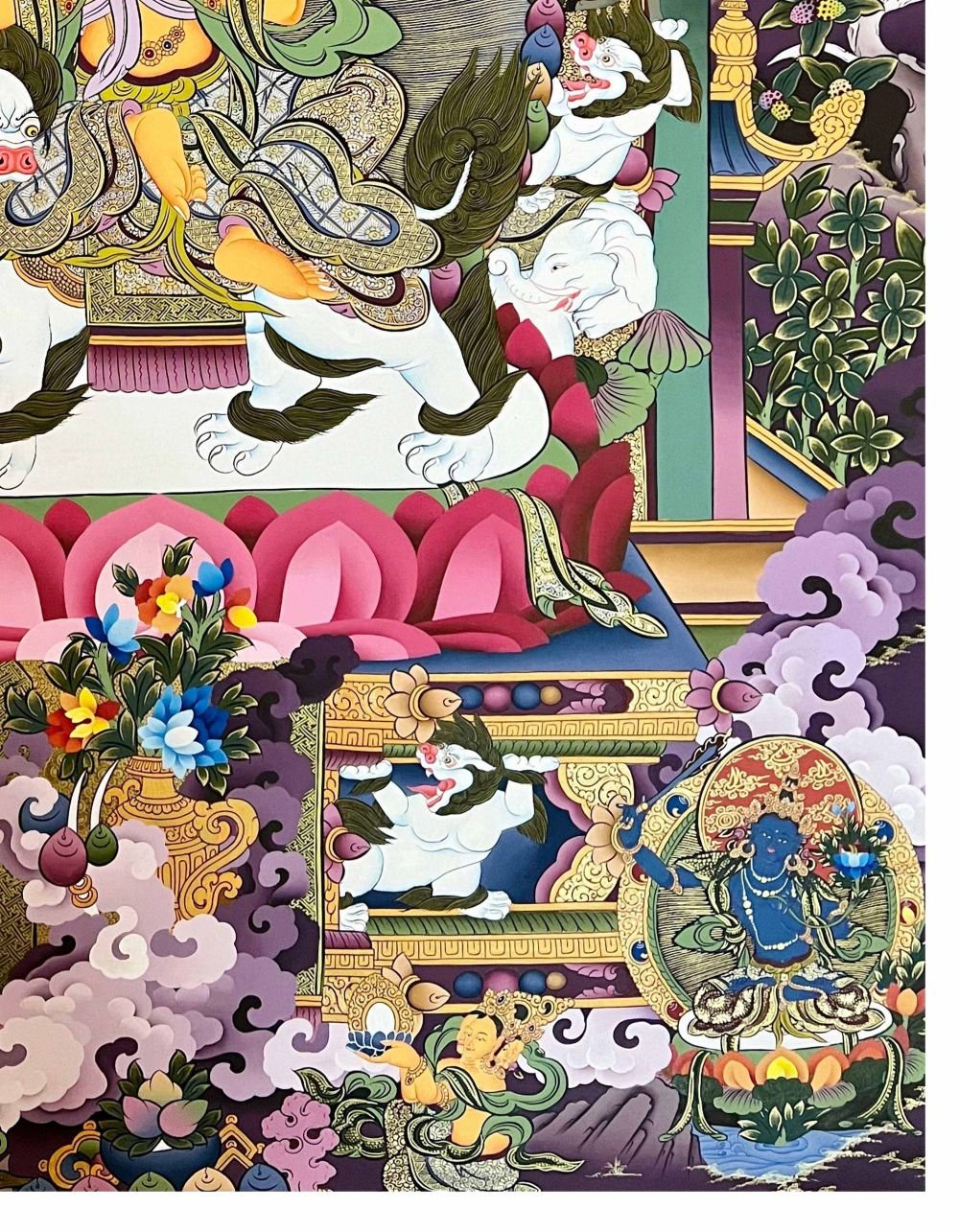 Lion Five Dhyani Manjushri Thangka, Tibetan Buddhist Art, Hand Painted, Real Gold , Five Wisdom Aspects of Manjushri, Embodying Supreme Knowledge