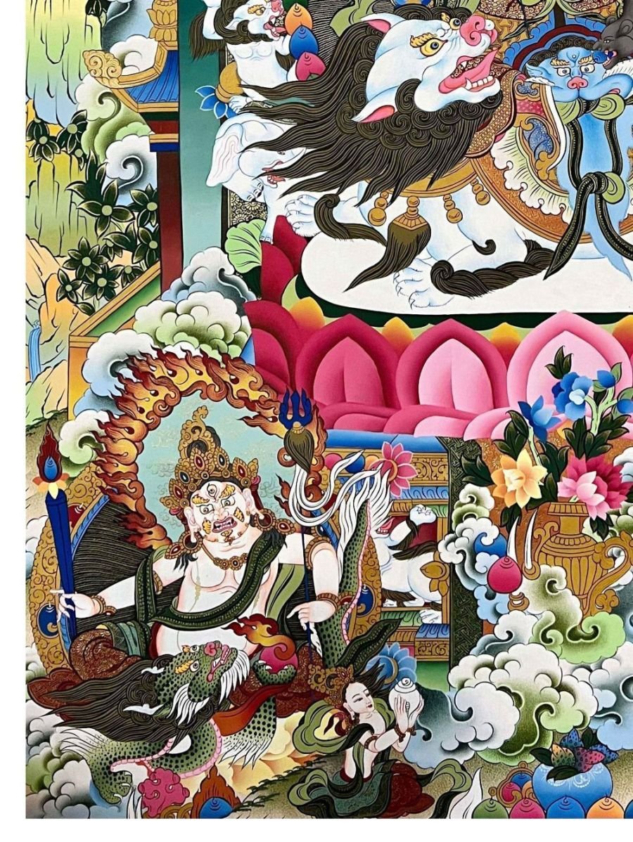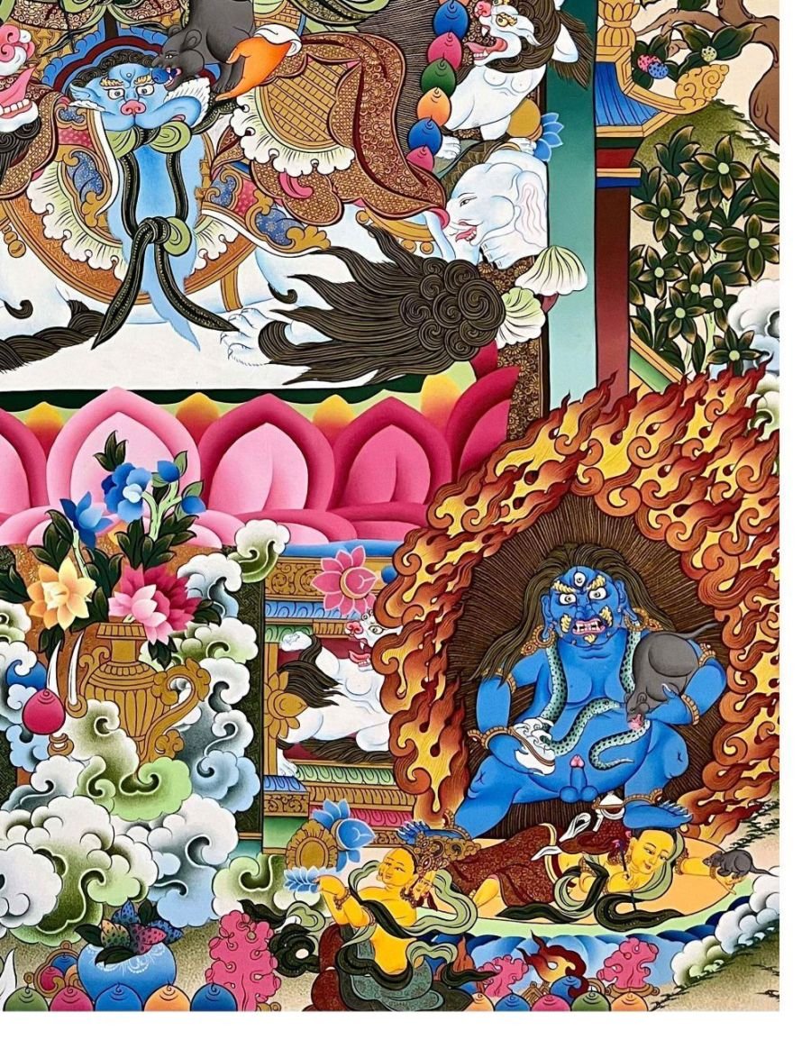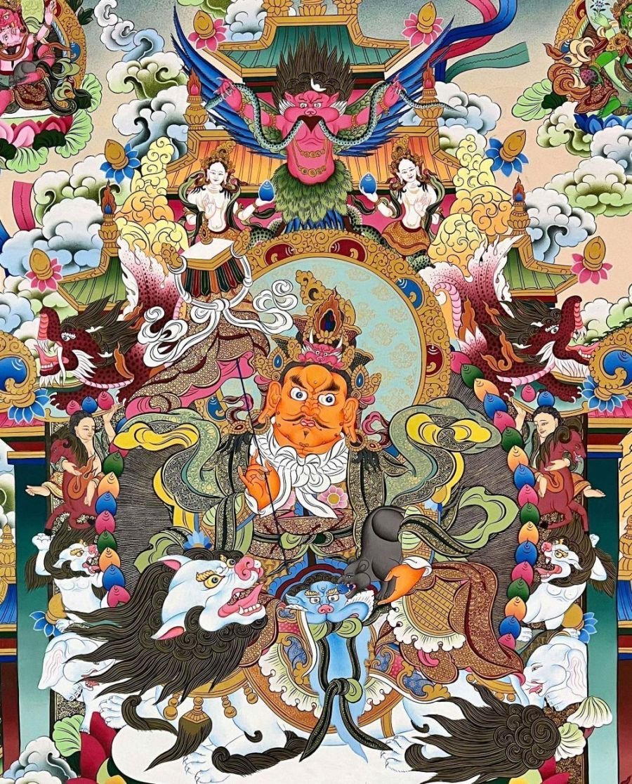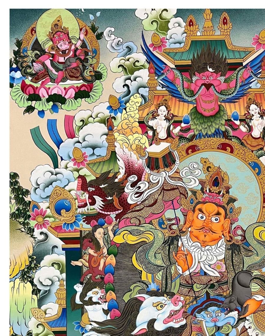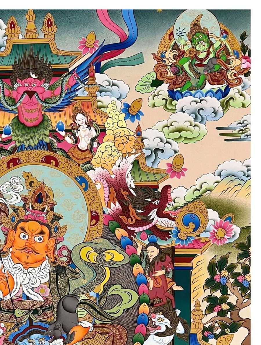 This thangka of Jambhala: namtose has real gold painted on its surface along with other paints. This is an ancient process of decorating the thangka in Tibetan Buddhism, Here gold is ground into gold dust, which is then mixed with other undisclosed material to make it paintable on the canvas. this mixture is then mixed with transparent glue and painted on the thangka. Read More