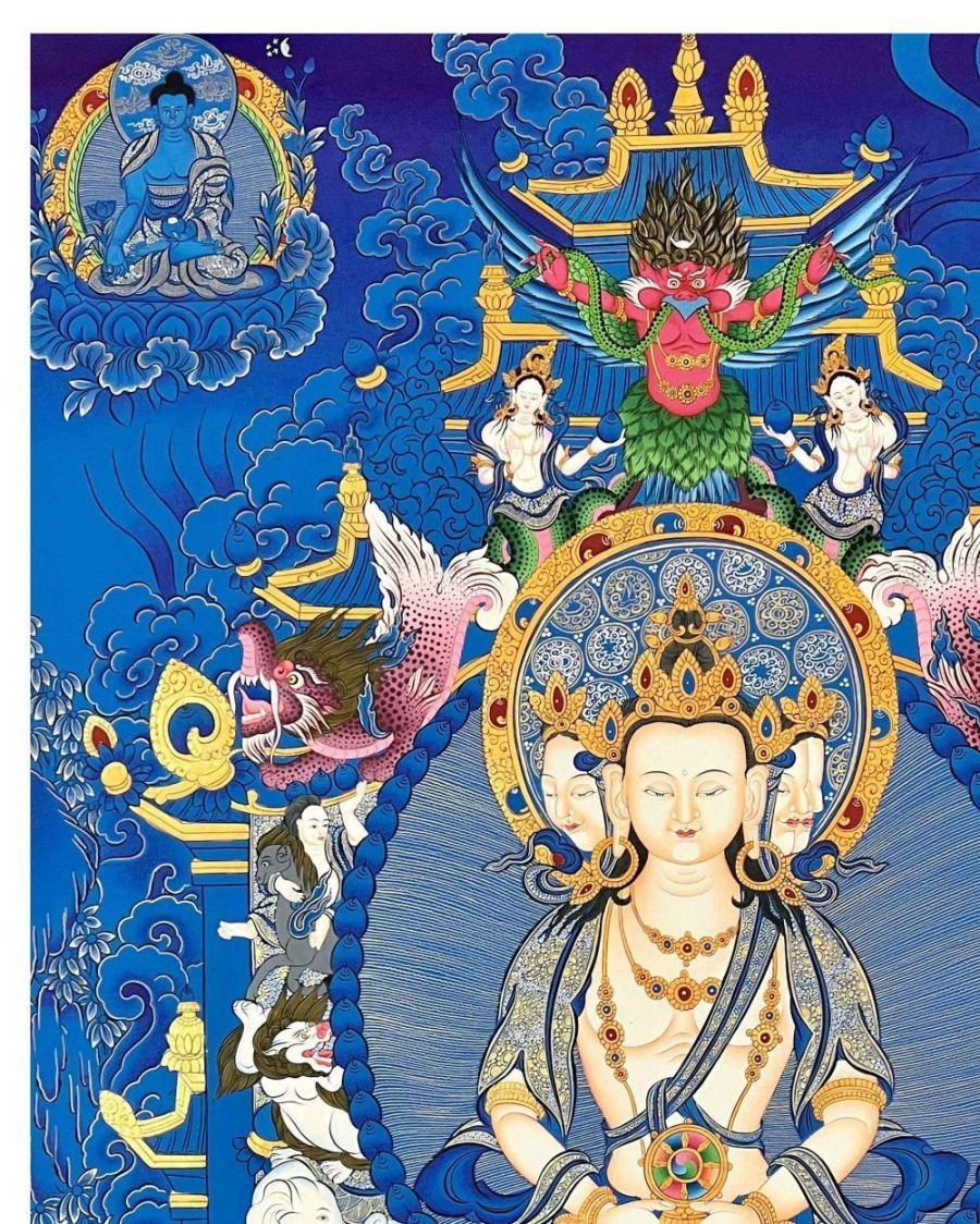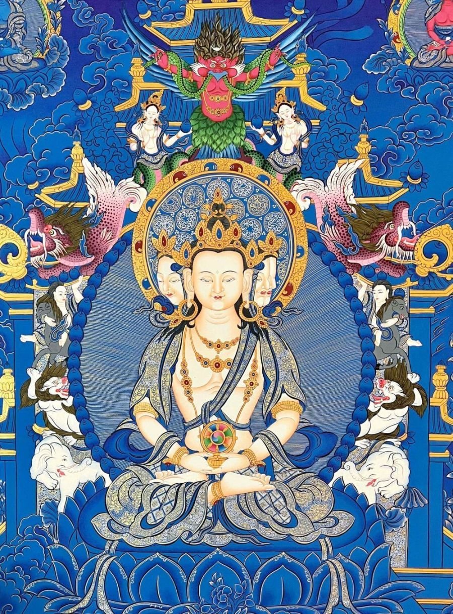 In depictions of Maha Virochana Buddha, additional arms and hands often accompany the four heads. These hands hold various symbolic objects, such as a lotus flower symbolizing purity and spiritual realization, and a vajra symbolizing indestructible power and the union of compassion and wisdom. These symbolic objects represent the Buddha's qualities of compassion, wisdom, and enlightened activity, emphasizing his role as a guiding force in the spiritual journey of practitioners.