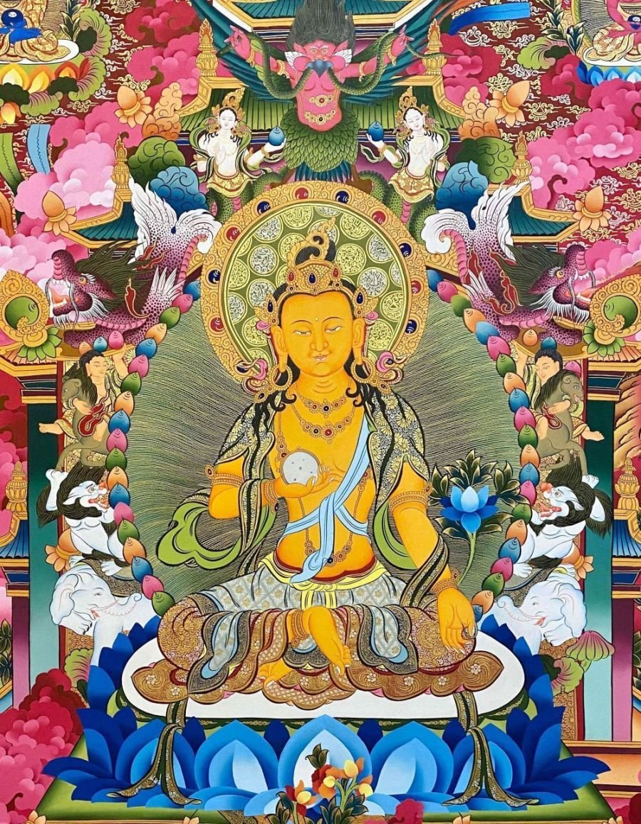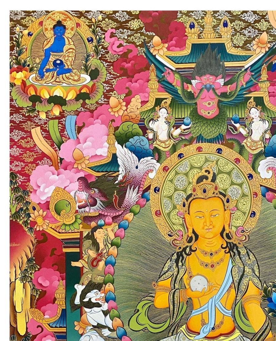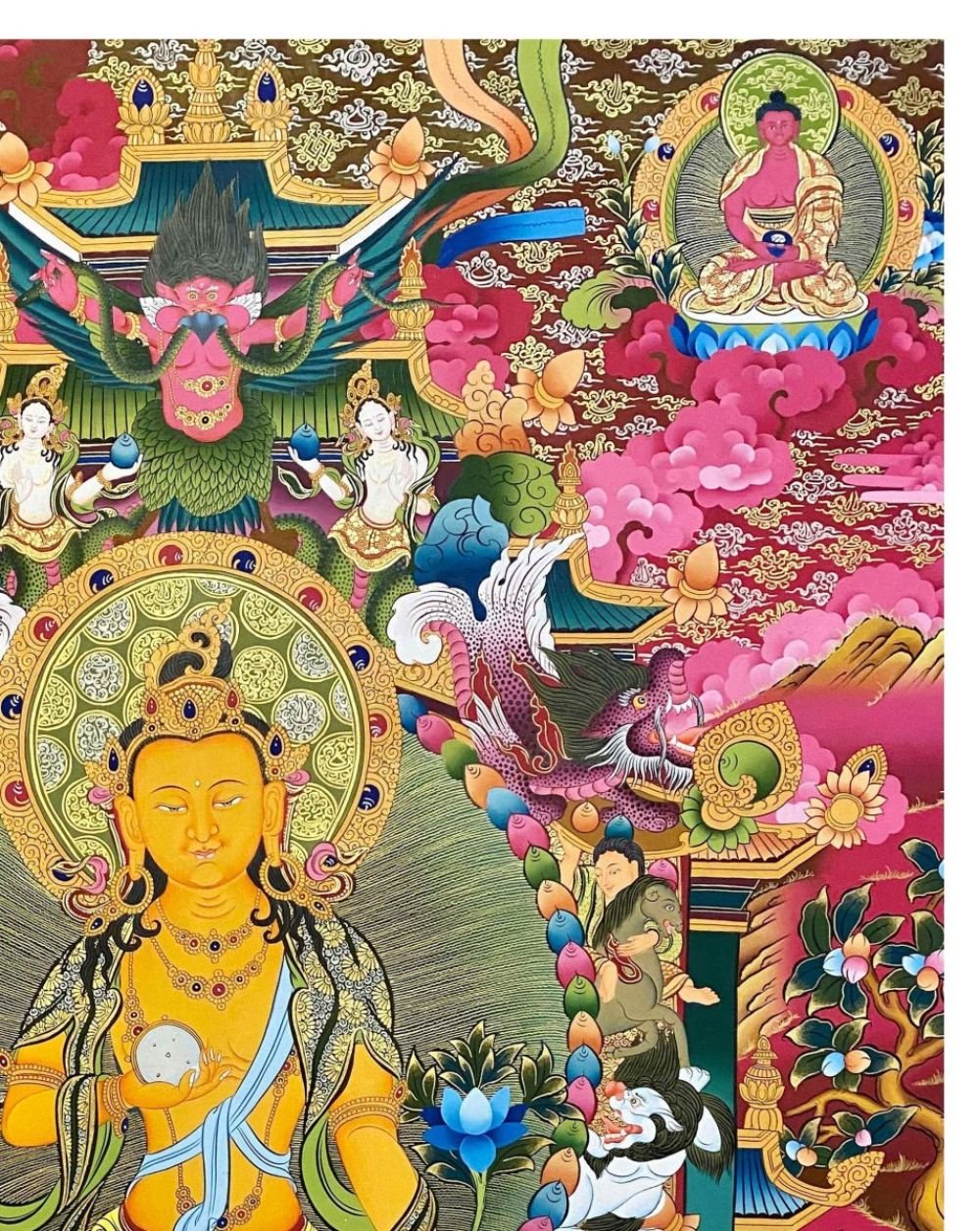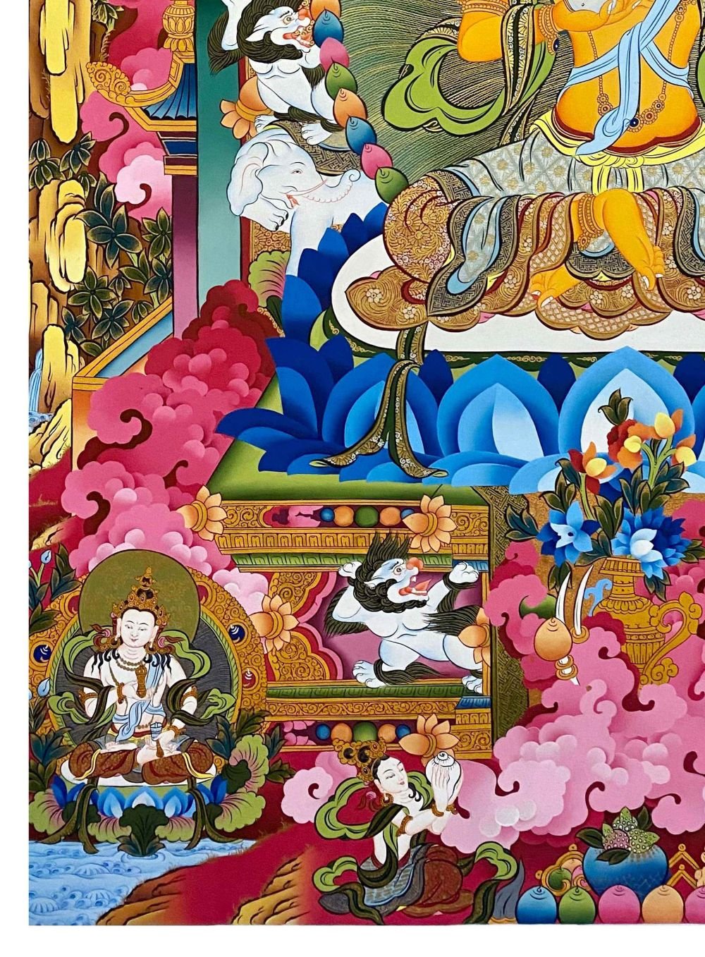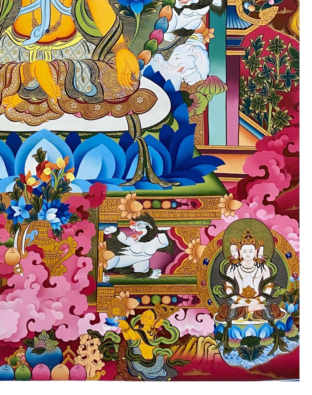 This thangka of ksitigarbha has real gold painted on its surface along with other paints. This is an ancient process of decorating the thangka in Tibetan Buddhism, Here gold is ground into gold dust, which is then mixed with other undisclosed material to make it paintable on the canvas. this mixture is then mixed with transparent glue and painted on the thangka. Read More
