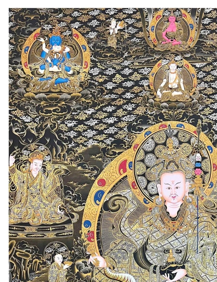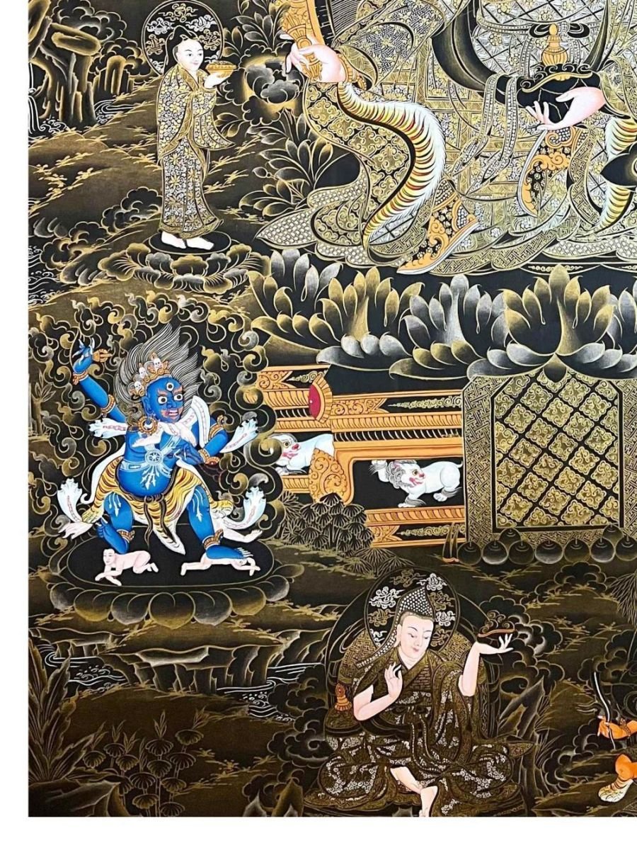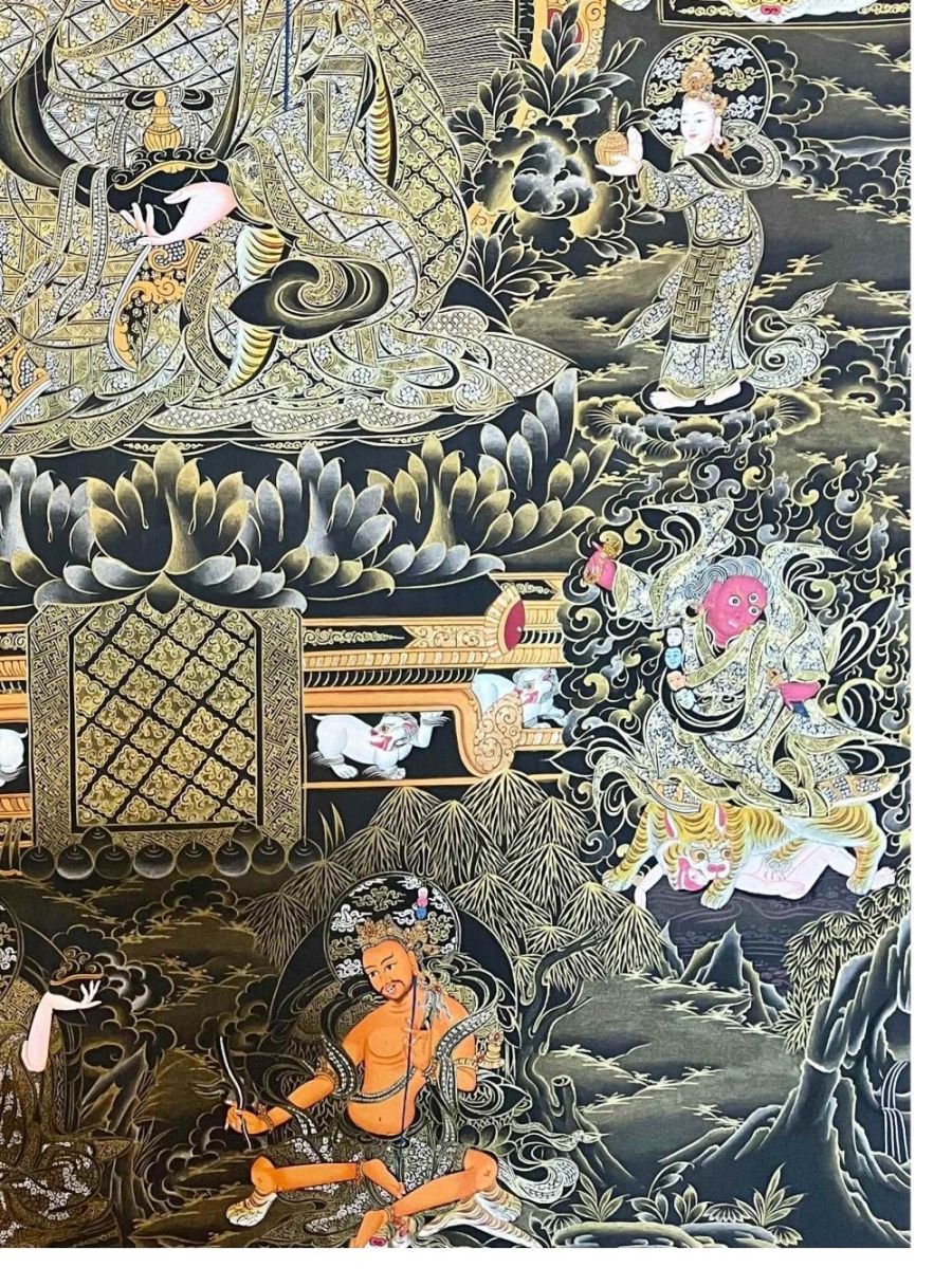This thangka of Padmasambhava has real gold painted on its surface along with other paints. This is an ancient process of decorating the thangka in Tibetan Buddhism, Here gold is ground into gold dust, which is then mixed with other undisclosed material to make it paintable on the canvas. this mixture is then mixed with transparent glue and painted on the thangka. Read More
