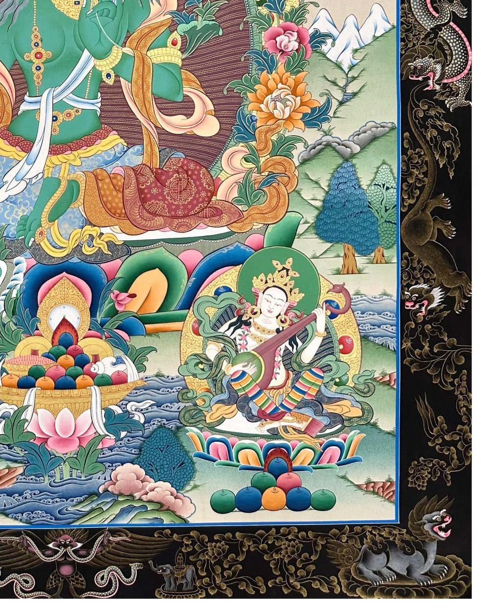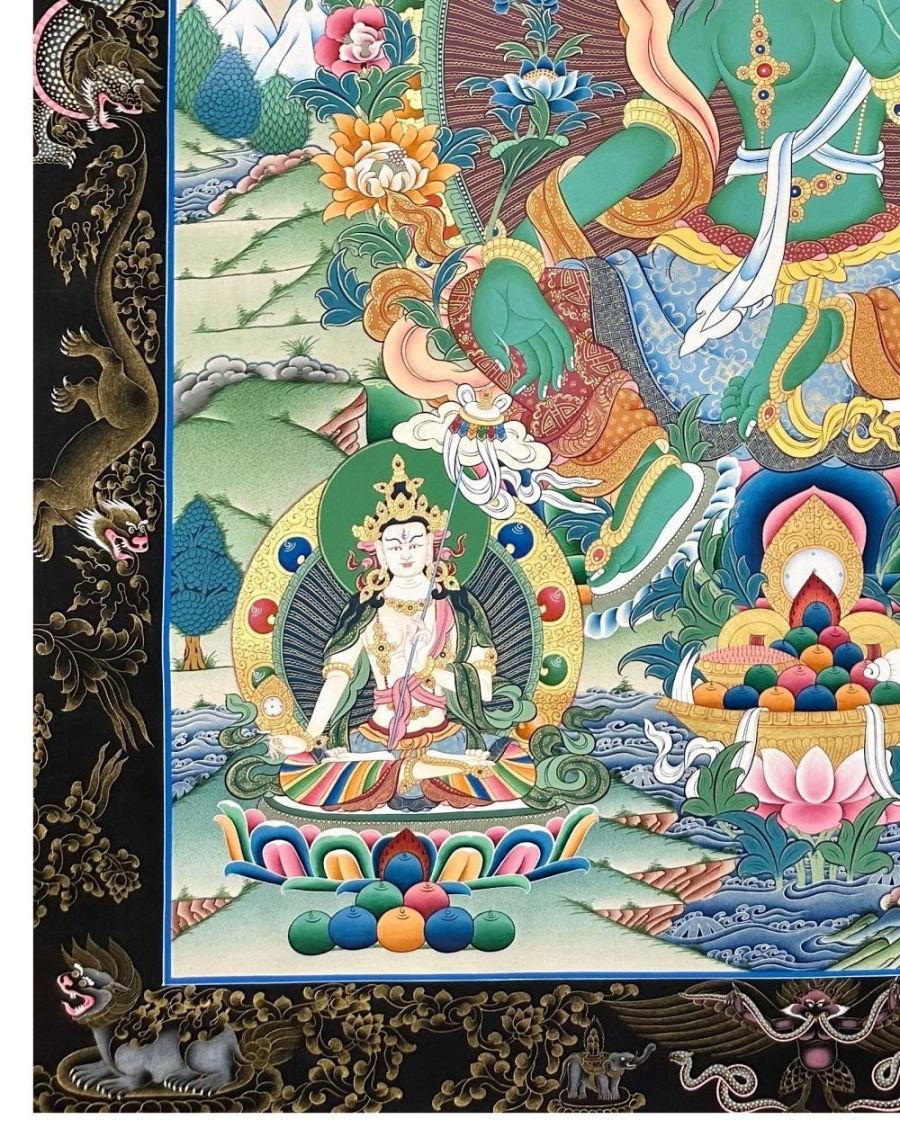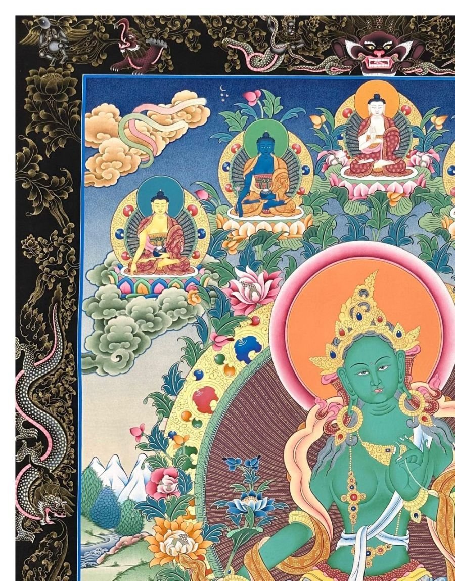Green Tara Thangka, Tibetan Buddhist Art, Hand Painted, Real Gold, Three Goddess of Divine Grace, Pancha Buddha, with Dragon Border , Goddess of Compassion, Protection, and Swift Action