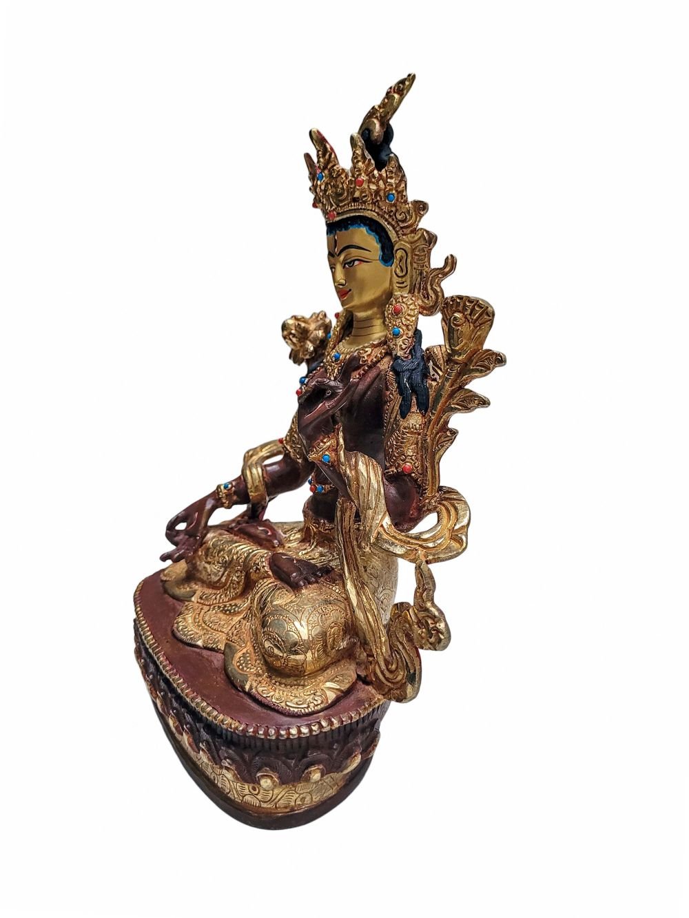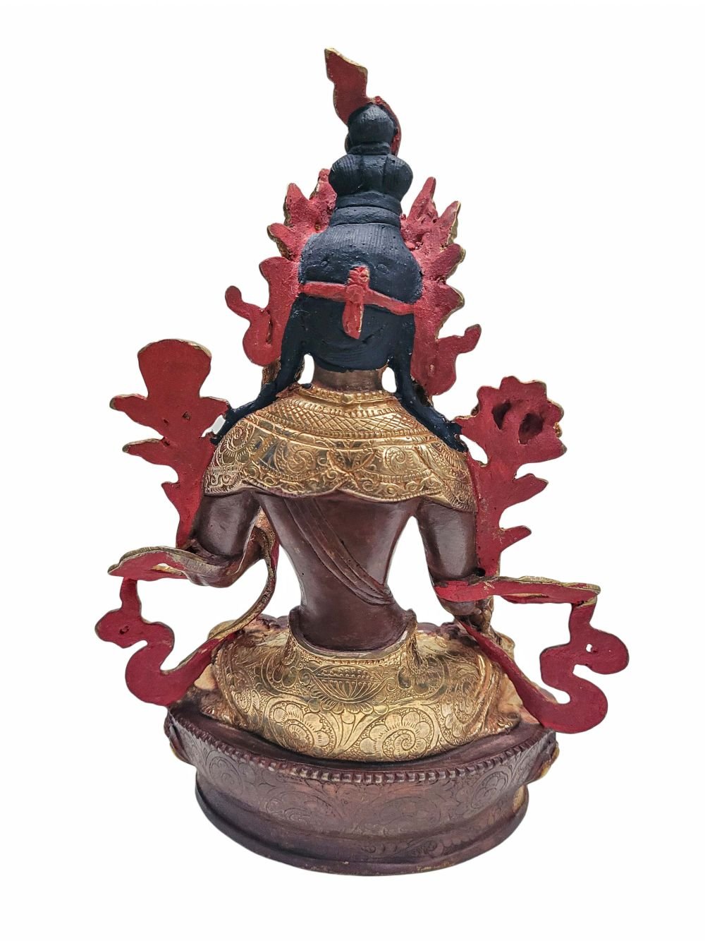 This White Tara has a Partly gold-plated finish. Partly fire gold gilding, a common practice in Nepali handicrafts. This technique is skillfully employed by artisans to create intricate designs on various metal objects, including statues, jewelry, and decorative items. Through a process, a mask or resist is applied to safeguard specific areas from the gold plating. The object is then subjected to high temperatures, allowing the gold to beautifully adhere to exposed surfaces using a combination of heat and pressure.